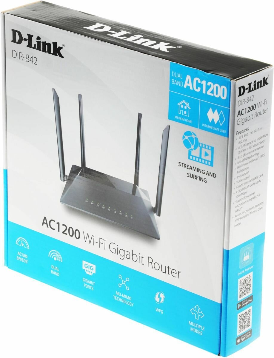 D-Link DIR-842 RU R4A Беспроводной EasyMesh маршрутизатор AC1200, 1000Base-T WAN, 4x1000Base-T LAN