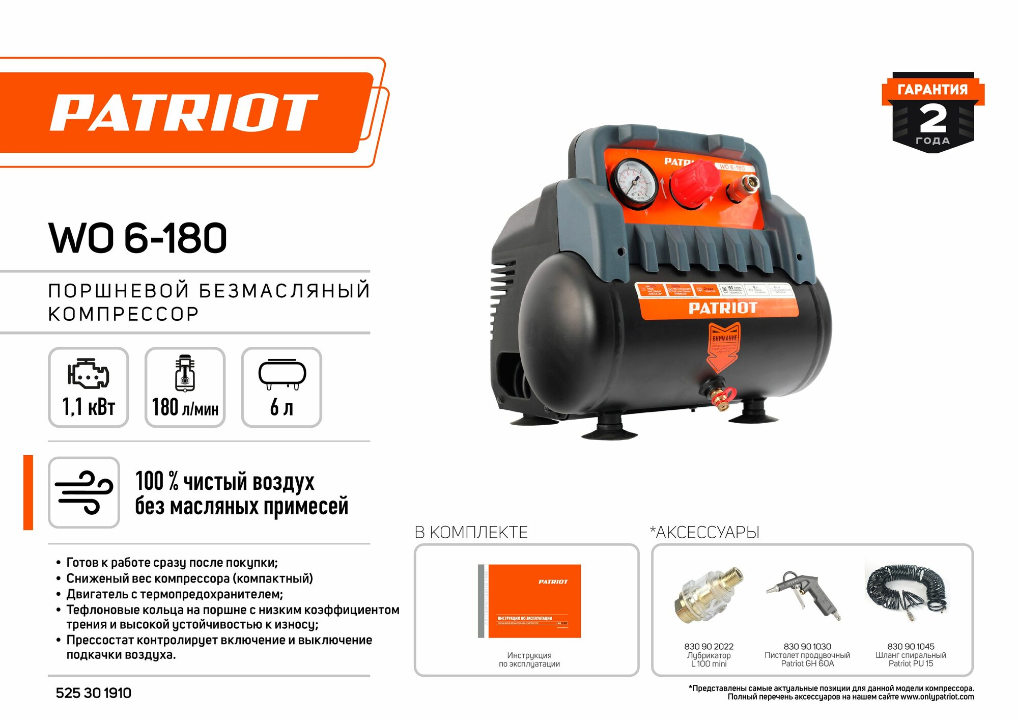 Компрессор PATRIOT WO 6-180 безмасляный 525301910