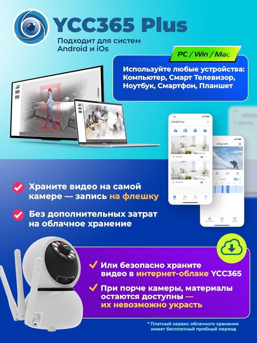 2. Беспроблемная настройка; все заявленные функции адекватно работают. 3. Качественный динамик, реально можно поговорить с собеседником. Это бывает далеко не всегда. 4. Имеет возможность создать отдельный wi-fi канал, т.е. можно обеспечить видеонаблюдение в отсутствие мобильной связи, например, далеко за городом в лесу, чисто между камерой и смартфоном, не используя облако. 5. Имеет разъём питания обыкновенный micro-USB, т.е. можно без проблем установить камеру в месте, где нет розеток 220в, используя power-bank. Это есть не у всех камер. 6. Очень яркие дальнобойные светодиоды ночной подсветки, который могут включаться автоматически по датчику движения. |