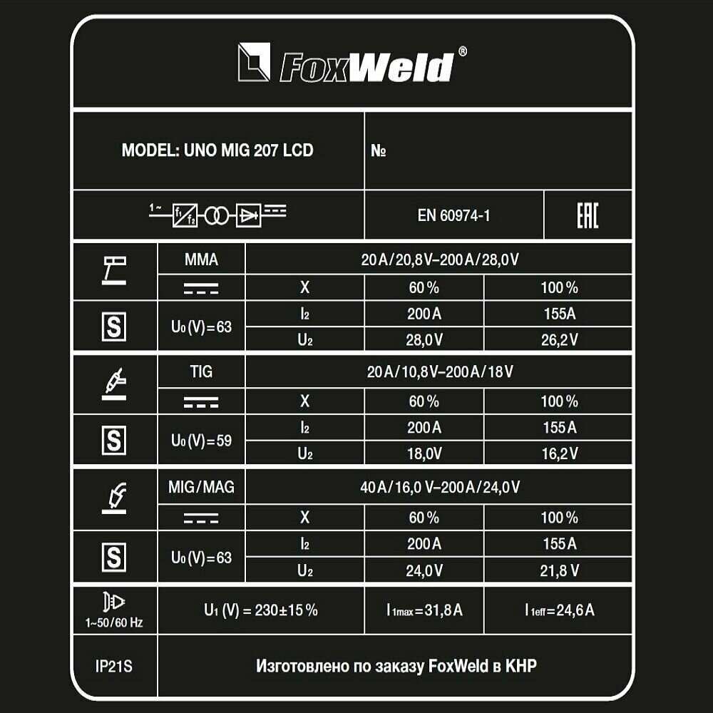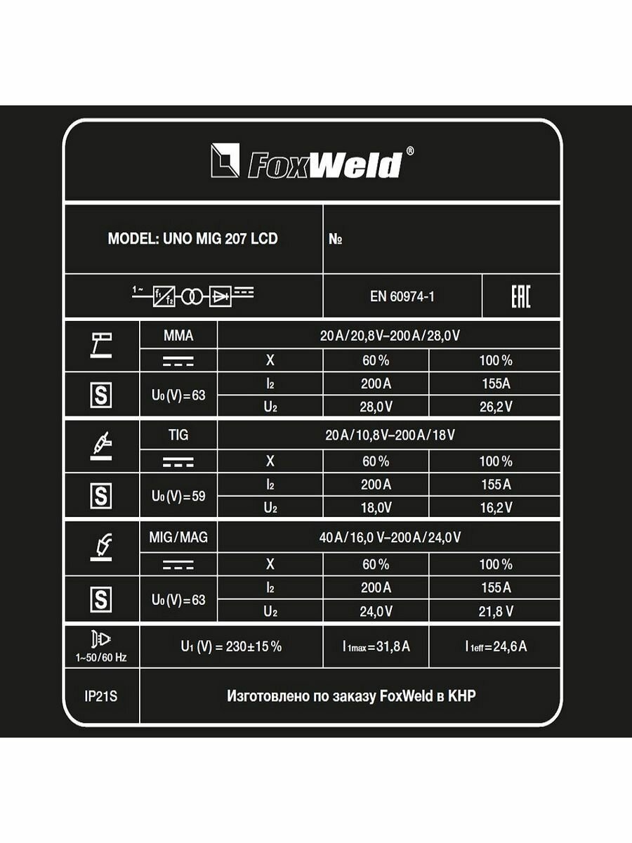 Сварочный аппарат инверторного типа FoxWeld UNO MIG 207 LCD, TIG, MMA, MIG/MAG