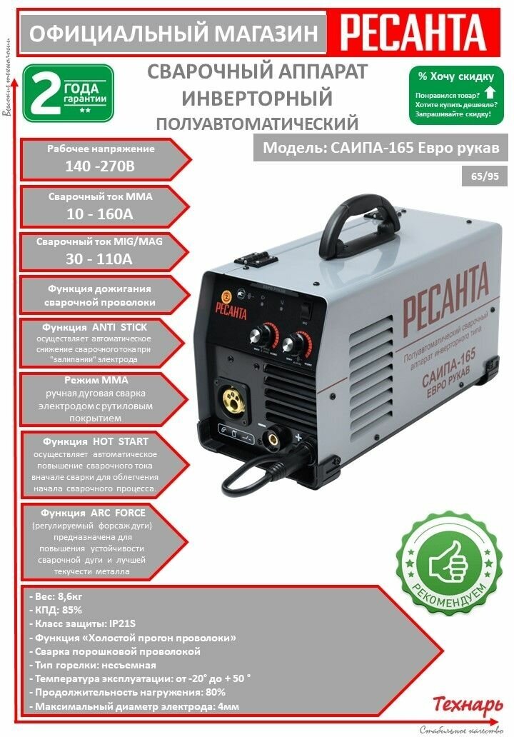 СохранитьСварочный полуавтомат Ресанта САИПА-165 Евро рукав (MIG/MAG) 65/95 интересное:
