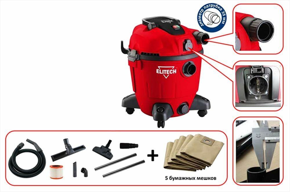 Строительный пылесос Elitech ПС 1235А, профессиональный, 1200Вт, 35л