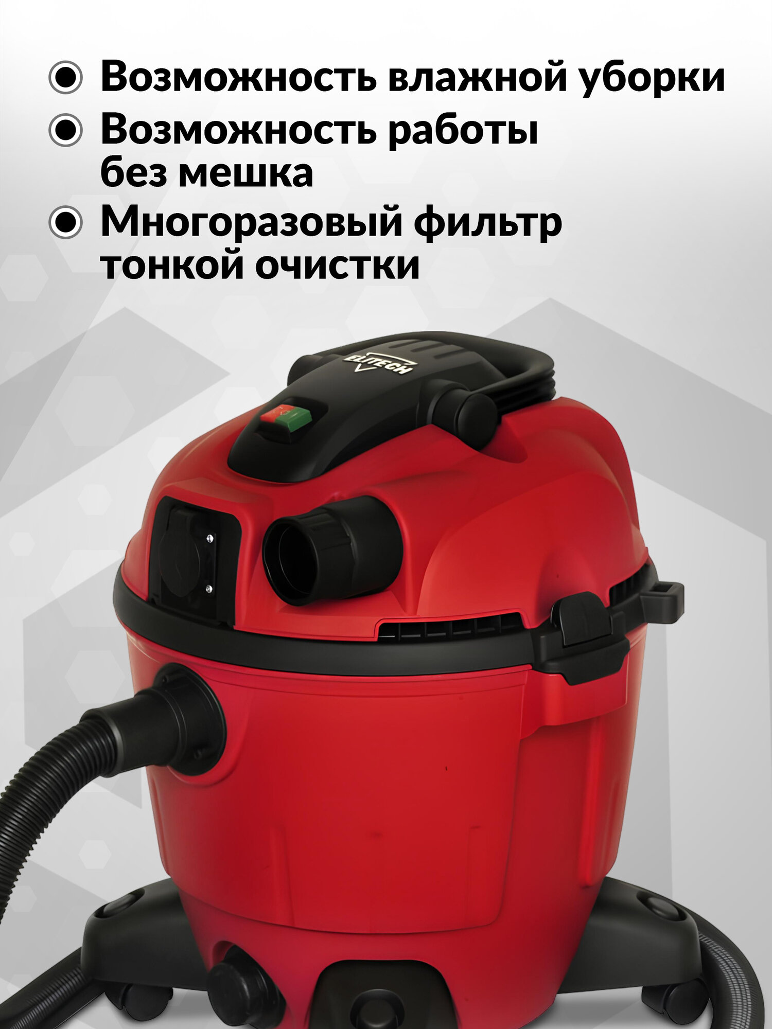 Профессиональный пылесос ELITECH ПС 1235А, 1200 Вт, красный