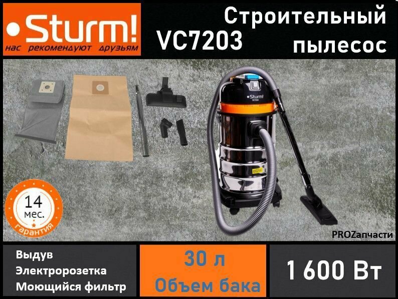 Пылесос промышленный VC7203 1600Вт,объём 30л,элект.розетка 2кВт,автоматич. вкл/откл Sturm!