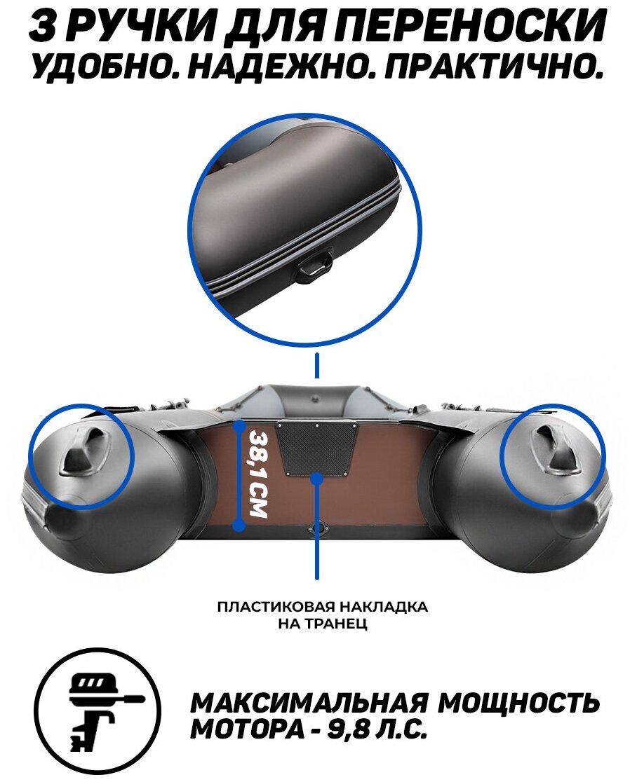 Надувная лодка Броня 340СК, ПВХ под мотор, трехместная, с усилением, слань+киль в комплекте