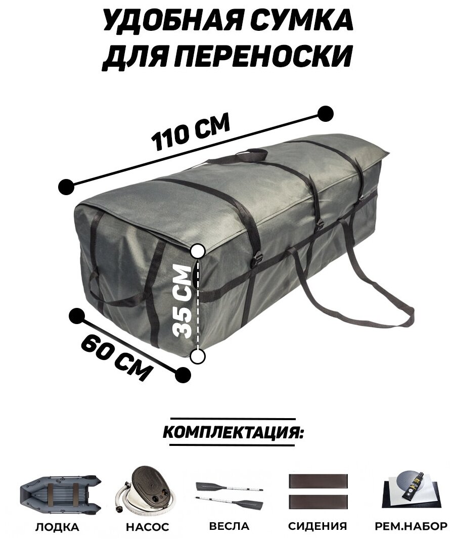 | Состав набора | Лодка, Насос 5л, 2 разборных весла, 2 сиденья (85см), ремкомплект, сумка, паспорт. |