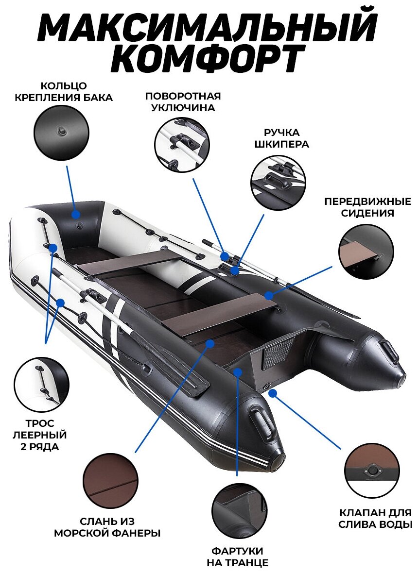 | Комплектация | ремкомплект, насос, весла, жесткое сиденье, уключины, привальный брус, ручки для переноски, леерный трос, клапан для слива воды |