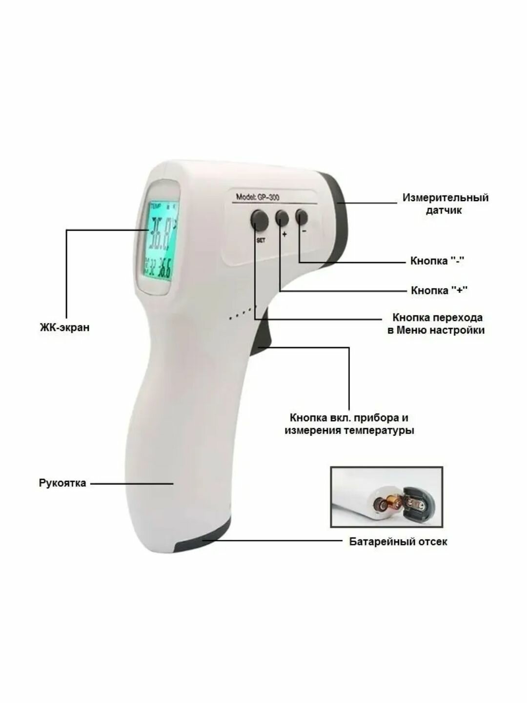 Бесконтактный инфракрасный термометр для измерения температуры человека (русская инструкция, с декларацией и батарейками) GP-300 (Ф) интересное: