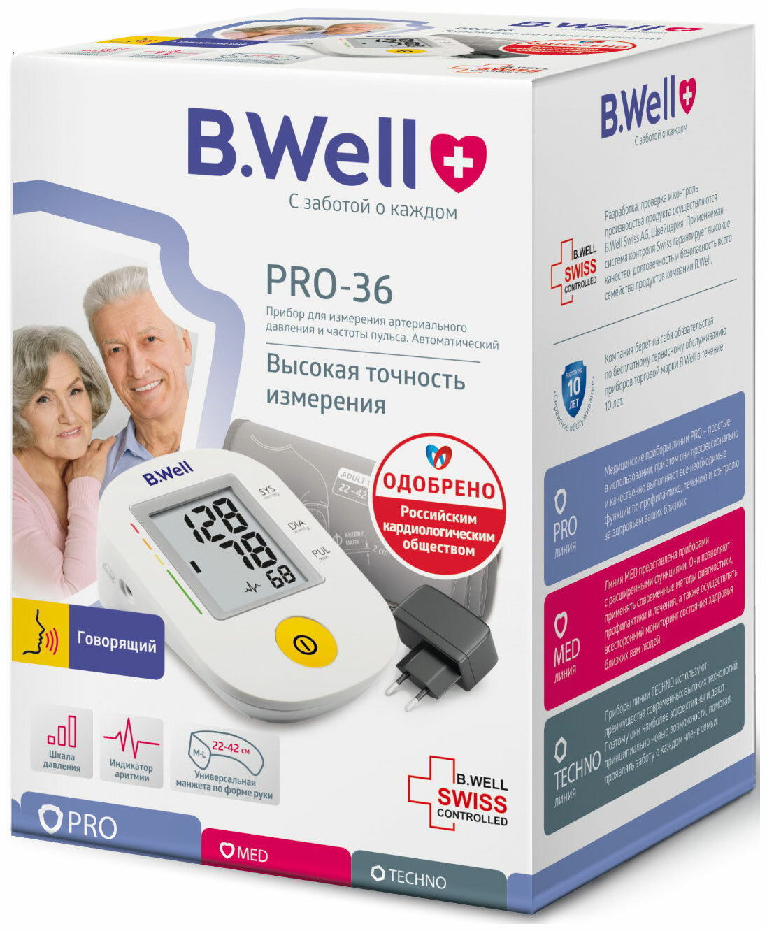 B.Well PRO-36 / БиВелл - автоматический тонометр на плечо, с голосовым сопровождением, адаптером и увеличенной манжетой