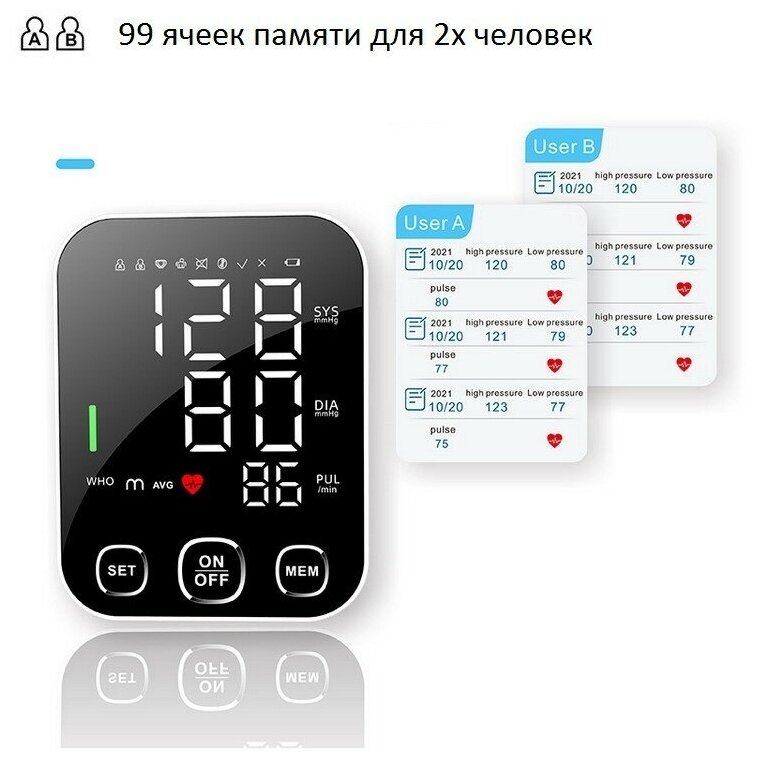 | Индикация | графический индикатор уровня АД / индикатор повышенного давления / индикатор аритмии / индикатор утренней гипертензии / индикатор движения / индикатор правильной фиксации манжеты / индикатор уровня заряда батареи |