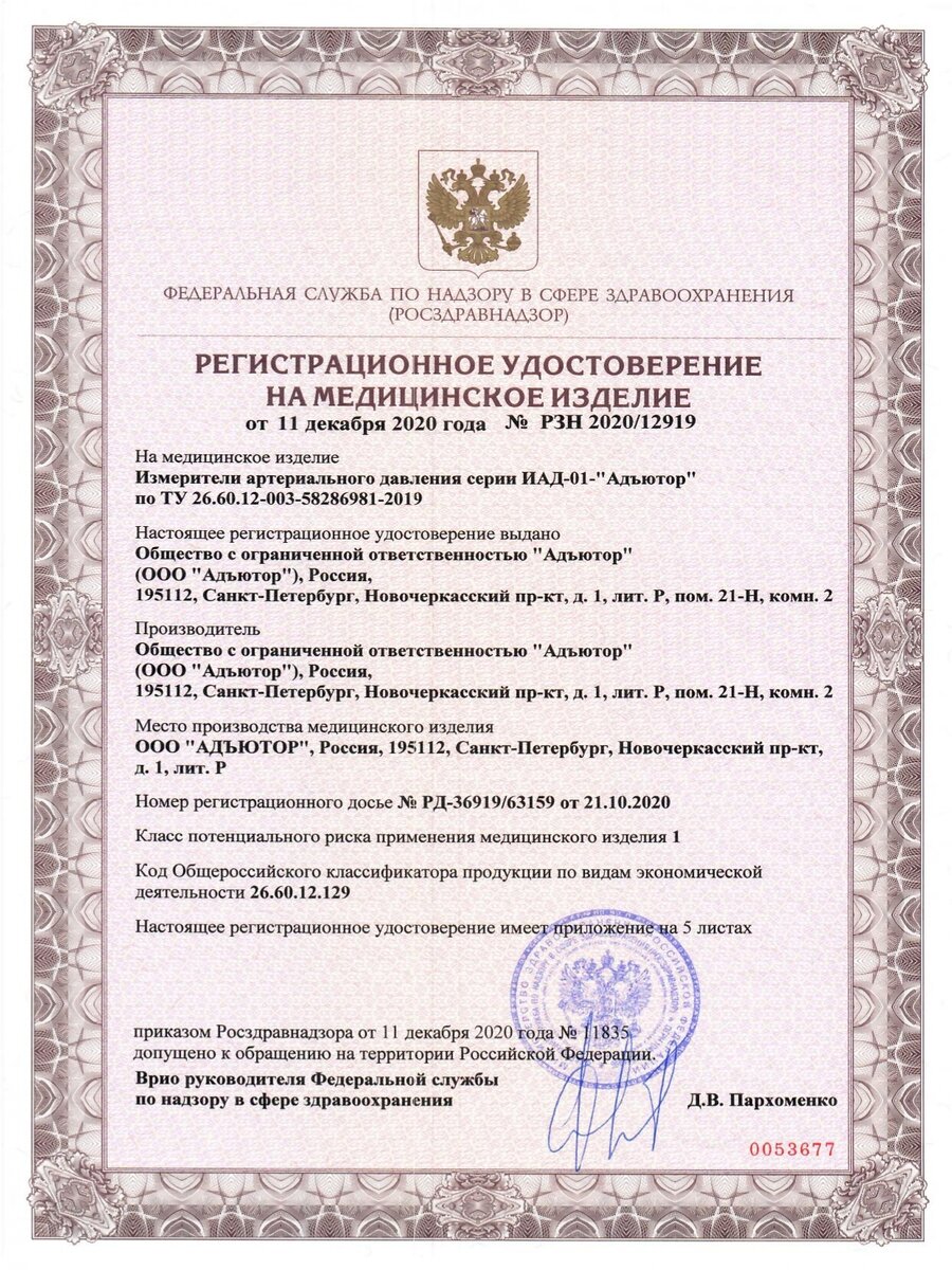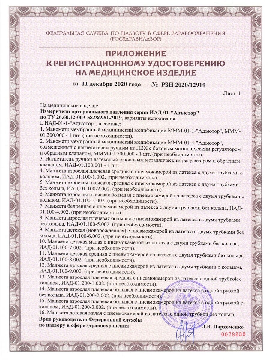 | Комплектация | "1. Манометр - Диаметр циферблата 50 мм 2. Манжета - Взрослая большая манжета без кольца, обхват (32-54 см), нейлоновая 3. Фонендоскоп - Стетофонендоскоп СФ-01 - «Адъютор»® с односторонней фонендоскопической головкой для аускультации тонов Короткова у взрослых. 4. Нагнетатель - нагнетатель ручной из натурального латекса с мет.игольчатым регулятором сброса давления и обратным клапаном 5. Пневмокамера цельнолитая 6. Паспорт: инструкция по эксплуатации+ описание прибора+гарантийный талон 7. Футляр 8. Индивидуальная упаковка коробка из микрогофрокартона" |