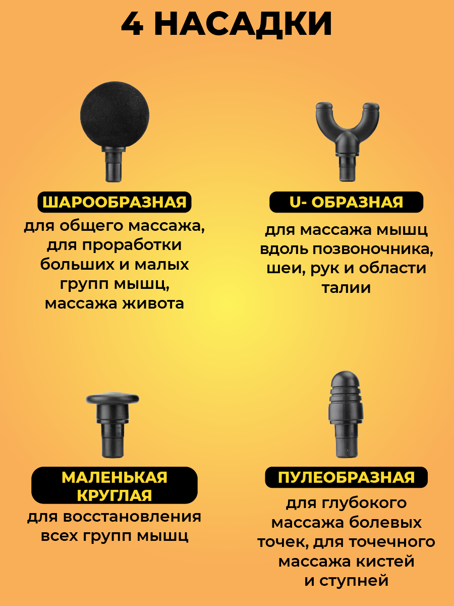| Подробная комплектация | Массажер глубоких тканей; Массажная насадка 6 шт.; Зарядный кабель TYPE-C; Инструкция на русском языке; Чехол для хранения |