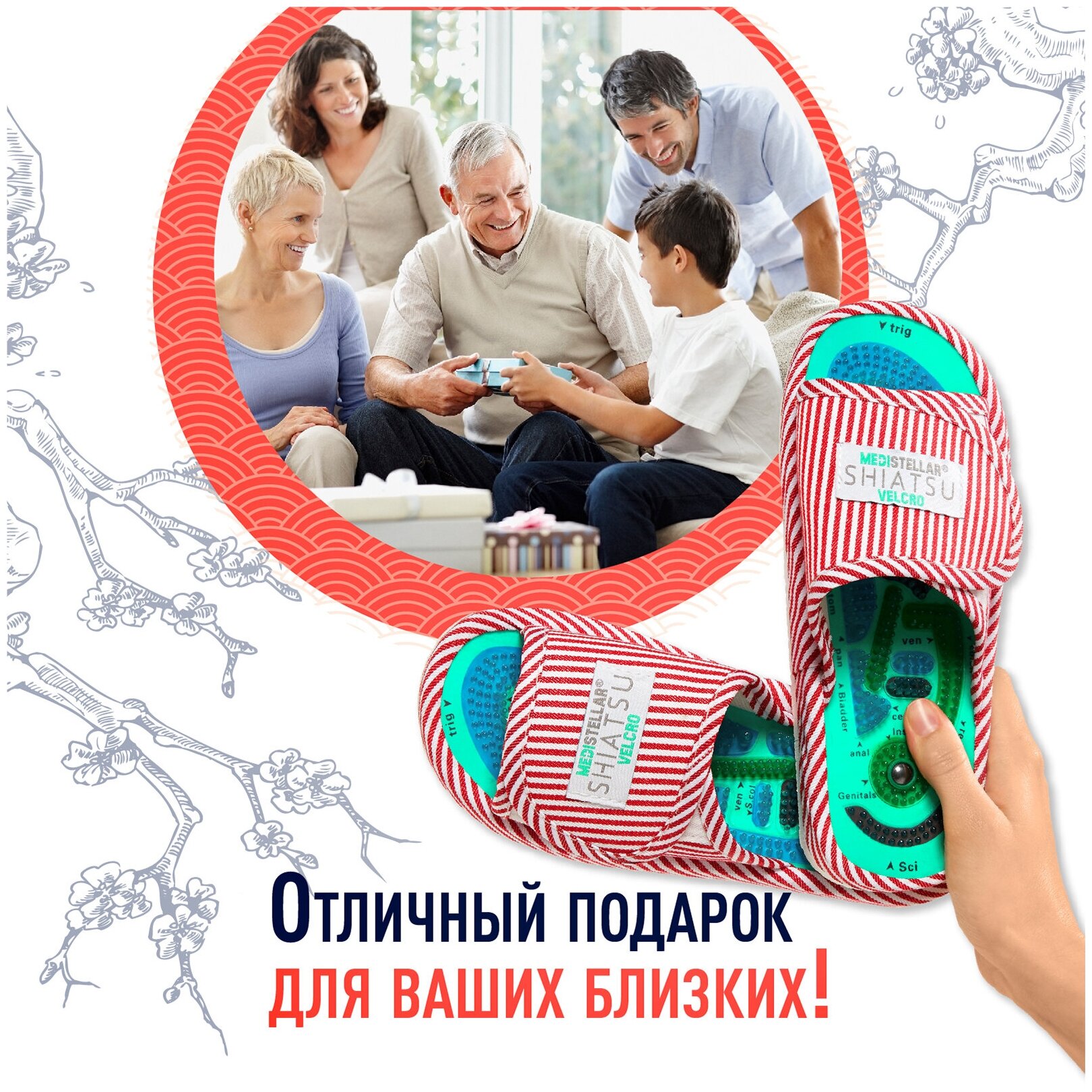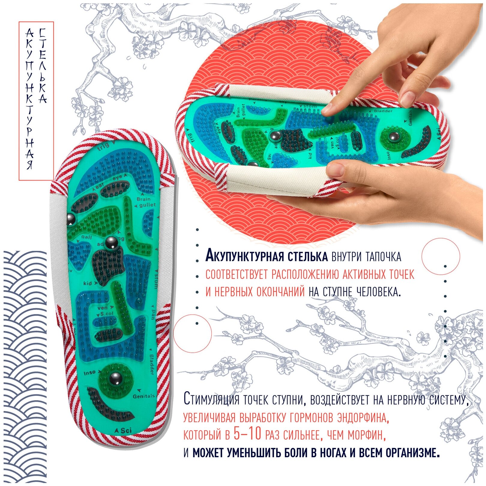| Подробная комплектация | Массажные тапочки, магниты, инструкция |
