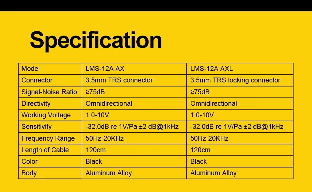 | Дополнительная информация | Модель LMS-12A AXL Тип петличный Штекер 3.5мм TRS с фиксатором Соотношение сигнал/шум ≥75 дБ Диаграмма направленности Круговая, всенаправленная Ветрозащита есть, поп-фильтр Тип капсуля конденсаторный Рабочее напряжение 1.0-10В Чувствительность -32.0дБ относительно 1В/Па±2дБ при 1 кГц Частотный диапазон 50Гц-20кГц Длина кабеля 120см Цвет Черный Материал корпуса Алюминиевый сплав Размер упаковки 110х70х20 мм Вес с упаковкой 30 г |