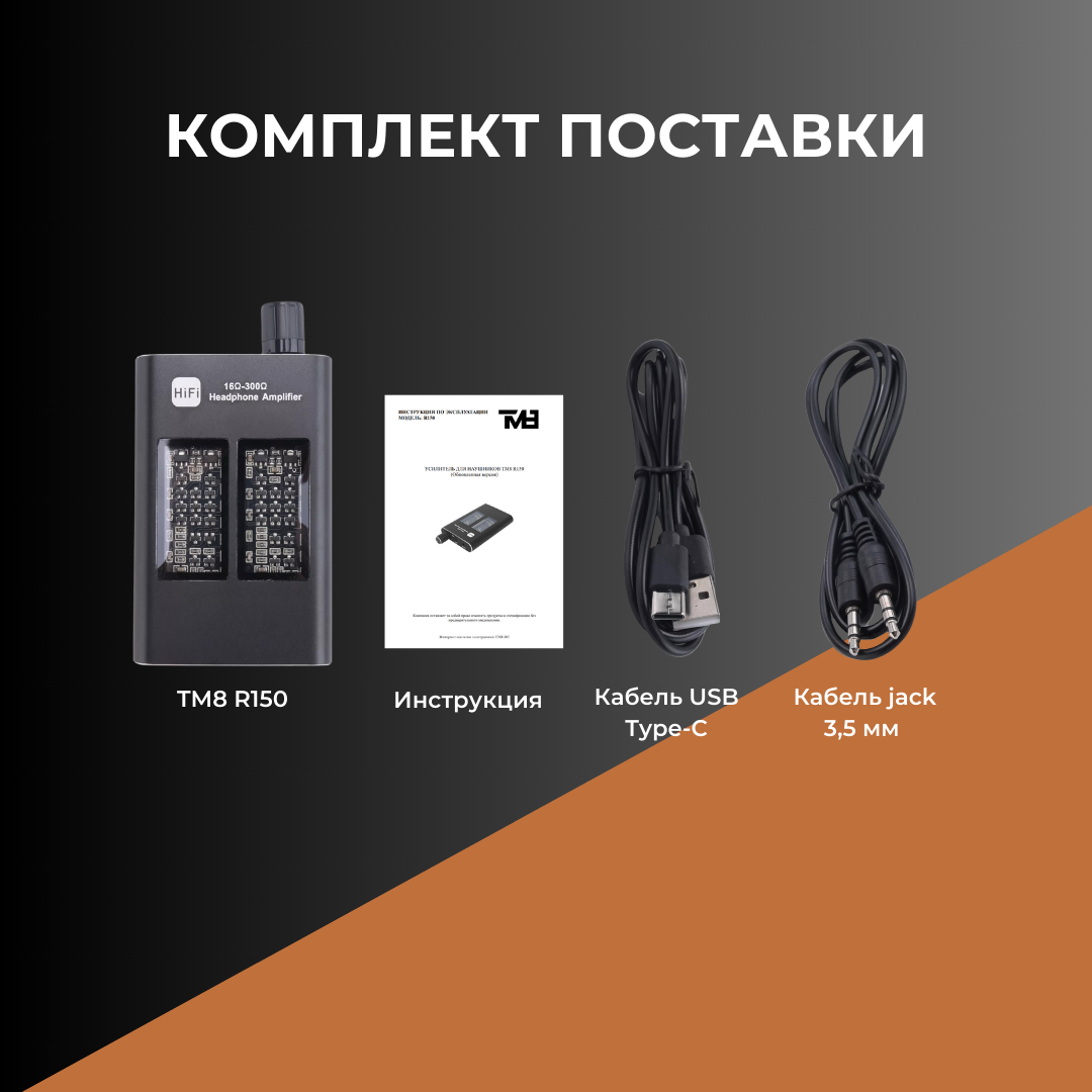 | Комплектация | усилитель для наушников TM8 R150, кабель USB Type-c, кабель jack 3.5, инструкция |