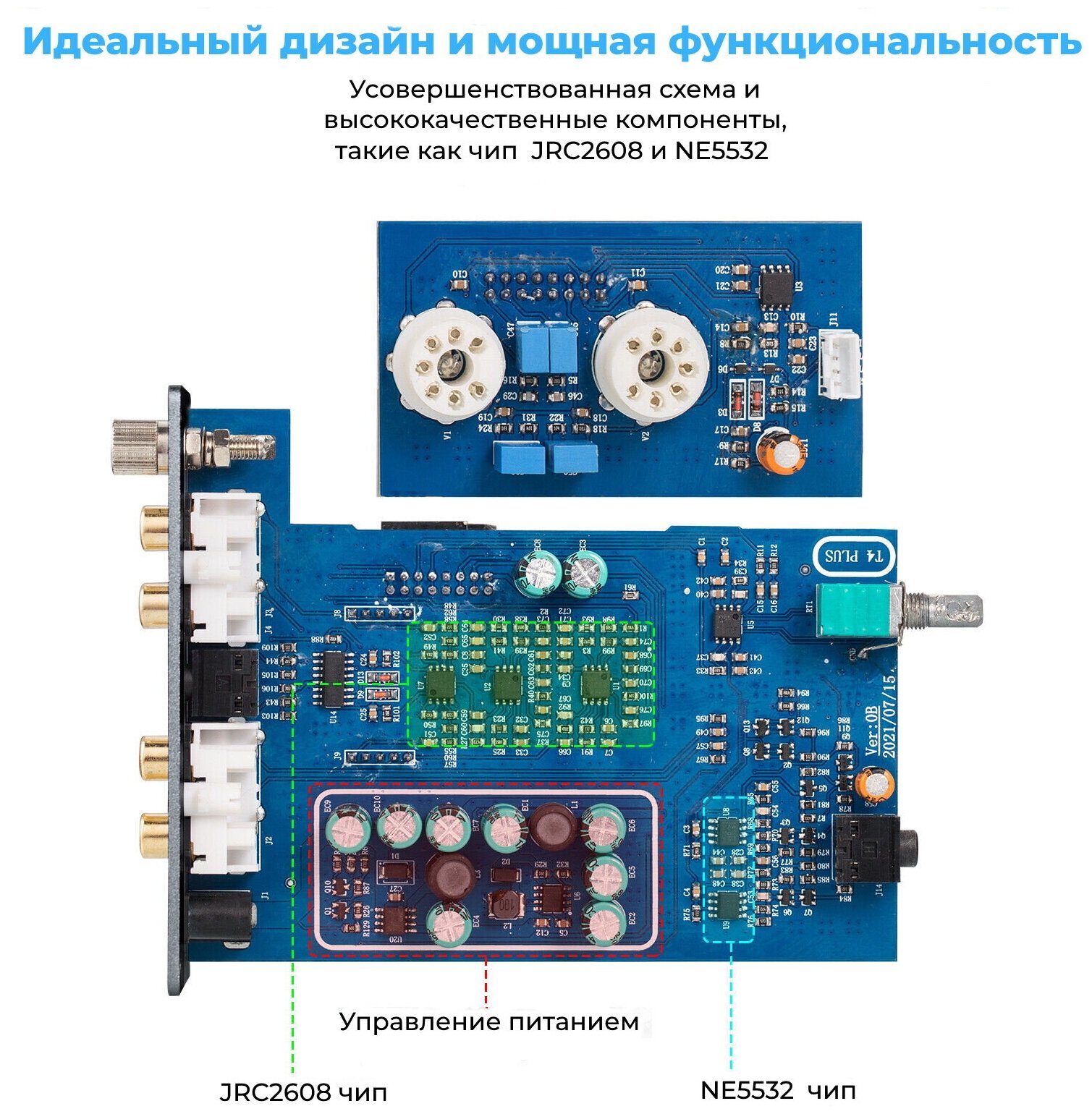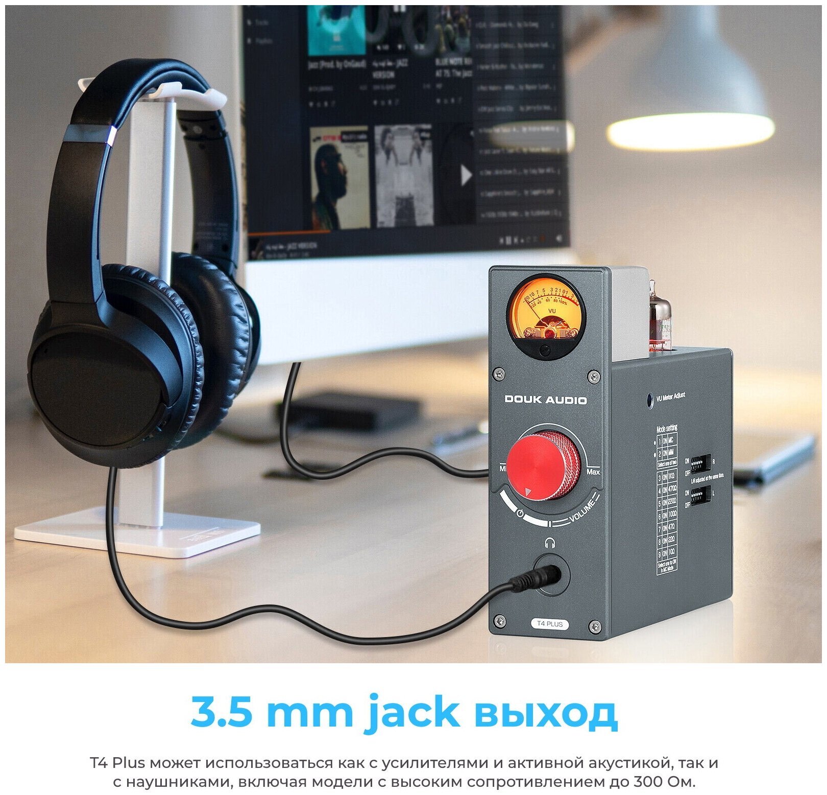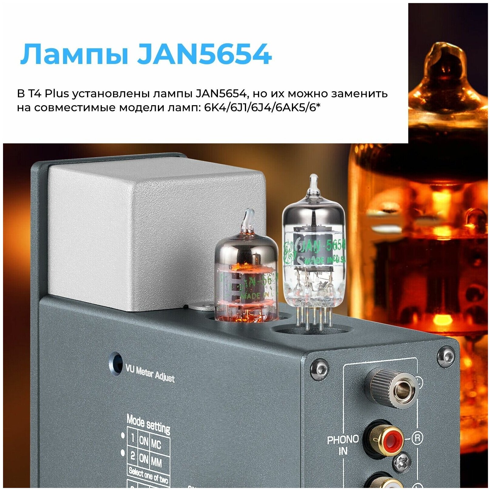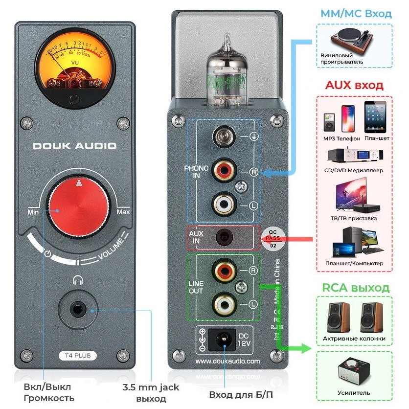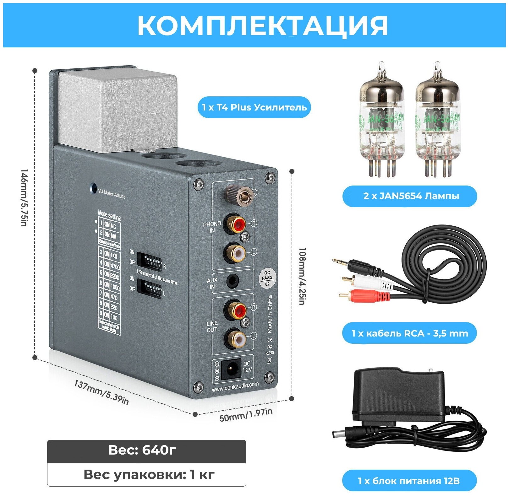 | Комплектация | 1 x Douk Audio T4 Plus, 2 х лампы JAN5654, 1 х кабель RCA – 3,5 mm, 1 x блок питания 12В |