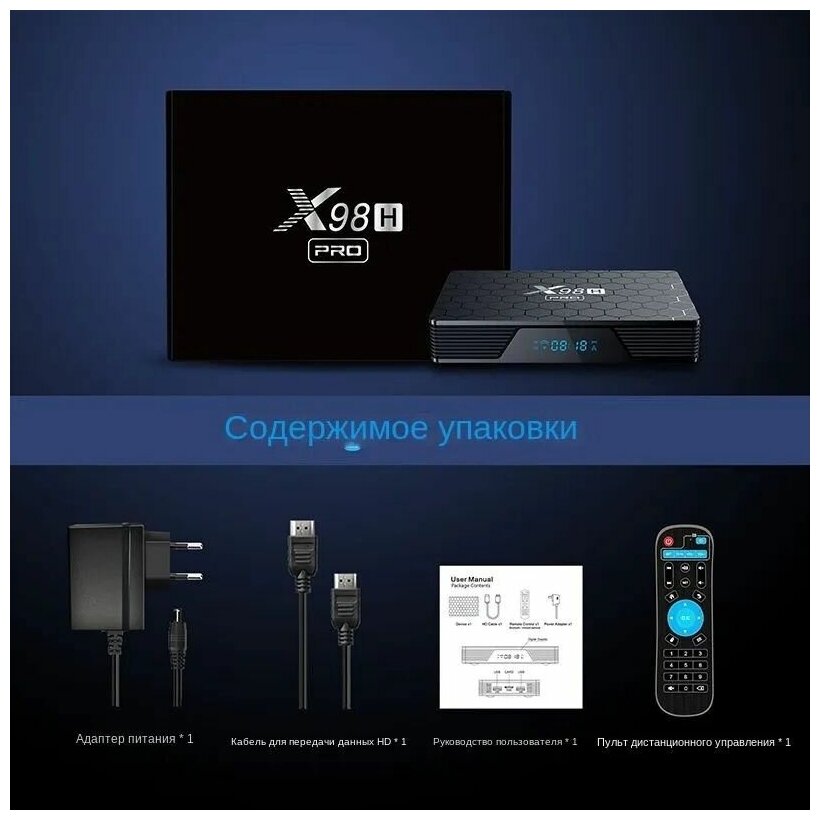| Подробная комплектация | В комплекте с X98H PRO имеется базовый ИК-пульт дистанционного управления, блок питания, кабель HDMI и инструкция |