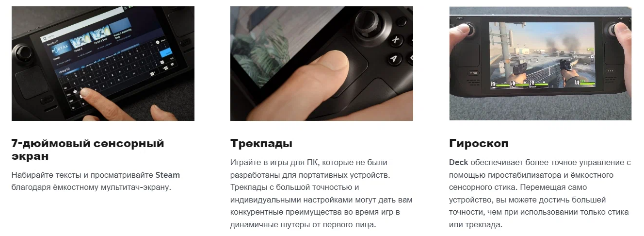 | Дополнительная информация | ЦП: Zen 2 4c/8t, 2,4–3,5 ГГц (до 448 гигафлопс FP32); графический процессор: RDNA 2 с восьмью вычислительными блоками, 1,0 ГГц–1,6 ГГц (до 1,6 терафлопс FP32); мощность APU: 4–15 Вт; 16 ГБ LPDDR5 встроенной оперативной памяти (5500 МТ/с, четыре 32-разрядных канала); USB-C с поддержкой альтернативного режима DisplayPort 1.4; до 8K при 60 Гц или 4K при 120 Гц, USB 3.2 Gen 2; операционная система: SteamOS 3.0 (основана на Arch Linux); док-станция приобретается отдельно |