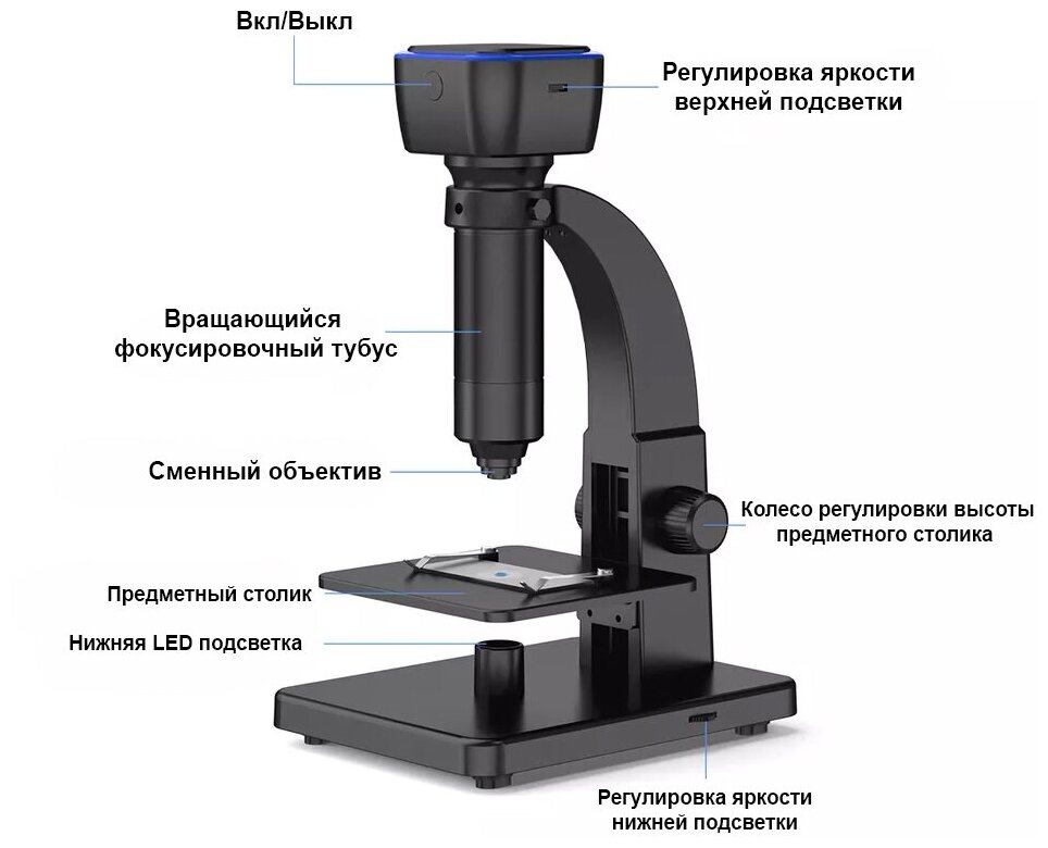 | Подробная комплектация | Цифровой микроскоп; Кабель USB Type-С; Кабель USB Type-A; Кабель Micro USB; Салфетка для ухода за оптикой; Набор готовых микропрепаратов (2 образца); Краткое руководство по эксплуатации и гарантийный талон |