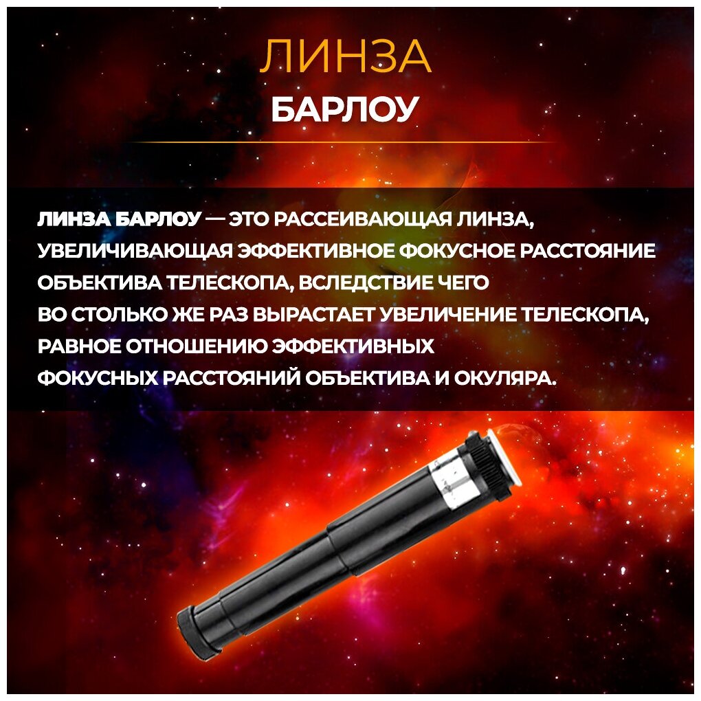 | Комплектация | Телескоп, треножный штатив, зенитный окуляр, окуляр H20 мм, окуляр H6 мм, светофильтр лунного света, увеличительная линза, инструкция на русском языке. |