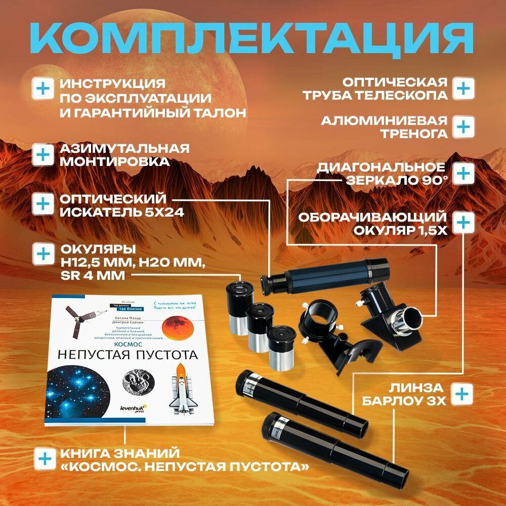 | Комплектация | оптическая труба телескопа, окуляр SR4 мм, окуляр H12,5 мм, окуляр H20 мм, оборачивающий окуляр 1,5х, диагональное зеркало 90°, линза Барлоу 3х, оптический искатель 5х24, азимутальная монтировка, алюминиевая тренога с лотком для аксессуаров, книга знаний «Космос. Непустая пустота», инструкция по эксплуатации и гарантийный талон |