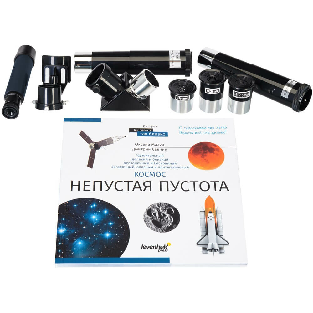 | Комплектация | Оптическая труба телескопа, окуляр SR4 мм, окуляр H12,5 мм, окуляр H20 мм, оборачивающий окуляр 1,5х, оптический искатель 5х24, диагональное зеркало 90°, линза Барлоу 3х, экваториальная монтировка EQ2, ручки тонких движений, противовес, штанга противовеса, крепежное кольцо, алюминиевая тренога с лотком для аксессуаров, книга знаний «Космос. Непустая пустота», инструкция по эксплуатации и гарантийный талон |