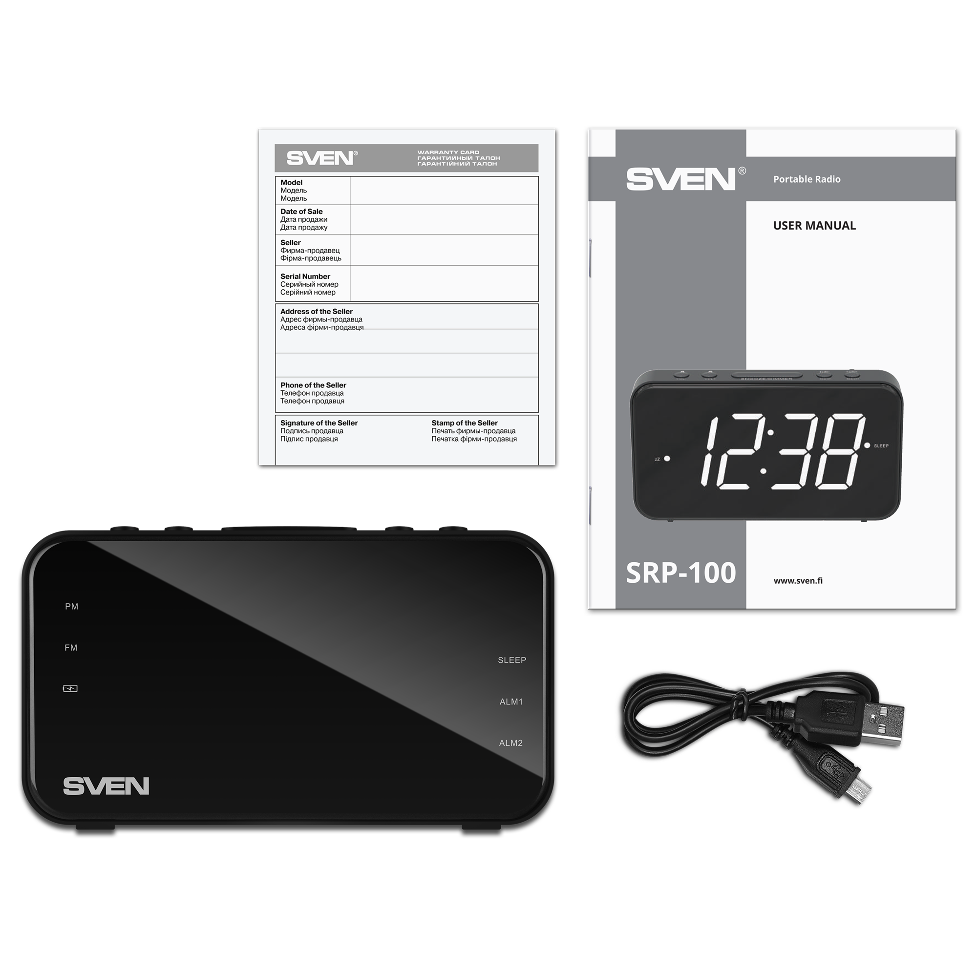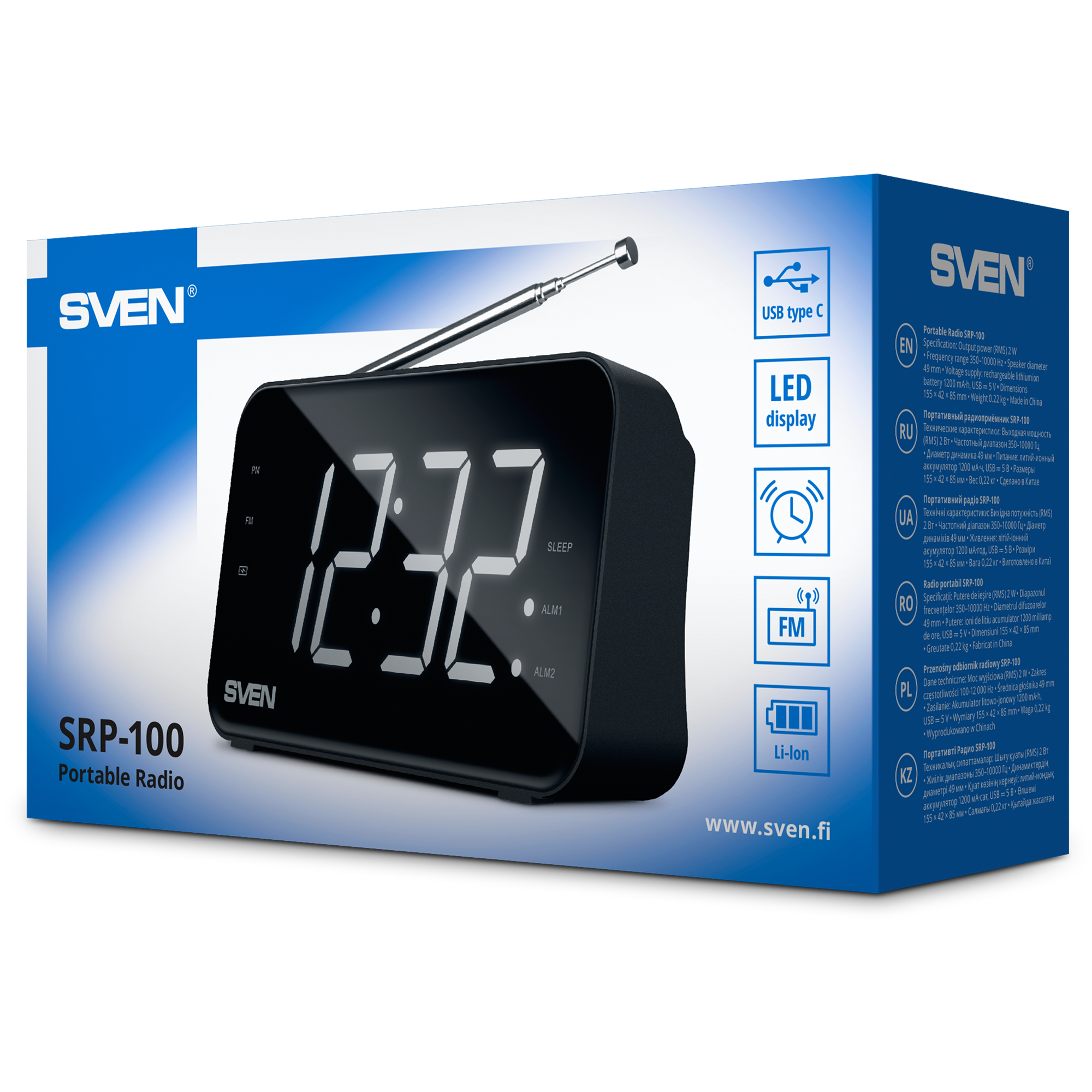 Радиоприемник SVEN SRP-100, (чер 2В RMS,FM,LED-дисп,вст часы и буд,вст акб)