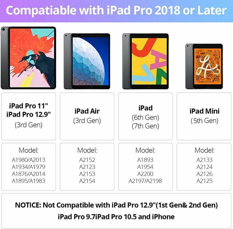 | Совместимость | iPad 10,2 2019 (7-го поколения) ( A2197 / A2198 / A2200) iPad 2018 9,7 (A1893 / A1954) iPad Air 3 10,5 2019 (A2152 / A2153 / A2154 / A2123) iPad Mini 5 2019 ( A2124 / A2125 / A2126 / A2133) iPad Pro 11 дюймов 2018 ( A1980 / A2013 / A1934 / A1979) iPad Pro 11 дюймов 2020 ( A2228 / A2231) iPad Pro 12,9 дюйма 2018 ( A1876 / A2014 / A1895 / A1983) iPad Pro 12,9 дюйма 2020 ( A2229 / A2069 / A2032 / A2233) |