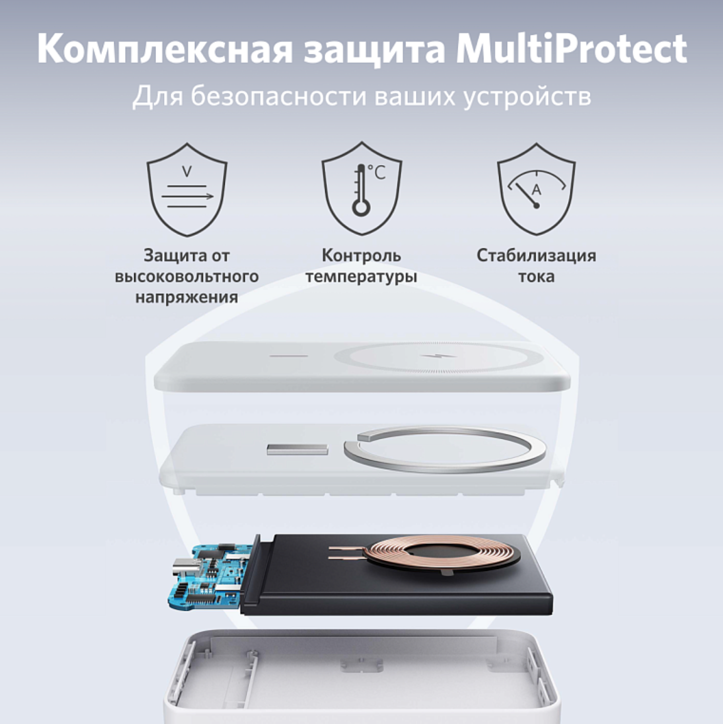 | Дополнительная информация | эксклюзивная технология безопасности MultiProtect, сверхпрочный магнит, питание от сети 220 В, технология Mini Cell, зарядки аккумулятора. С внешней стороны устройства расположена складная подставка. Совместимость: универсальный, смартфоны Apple с технологией MagSafe |