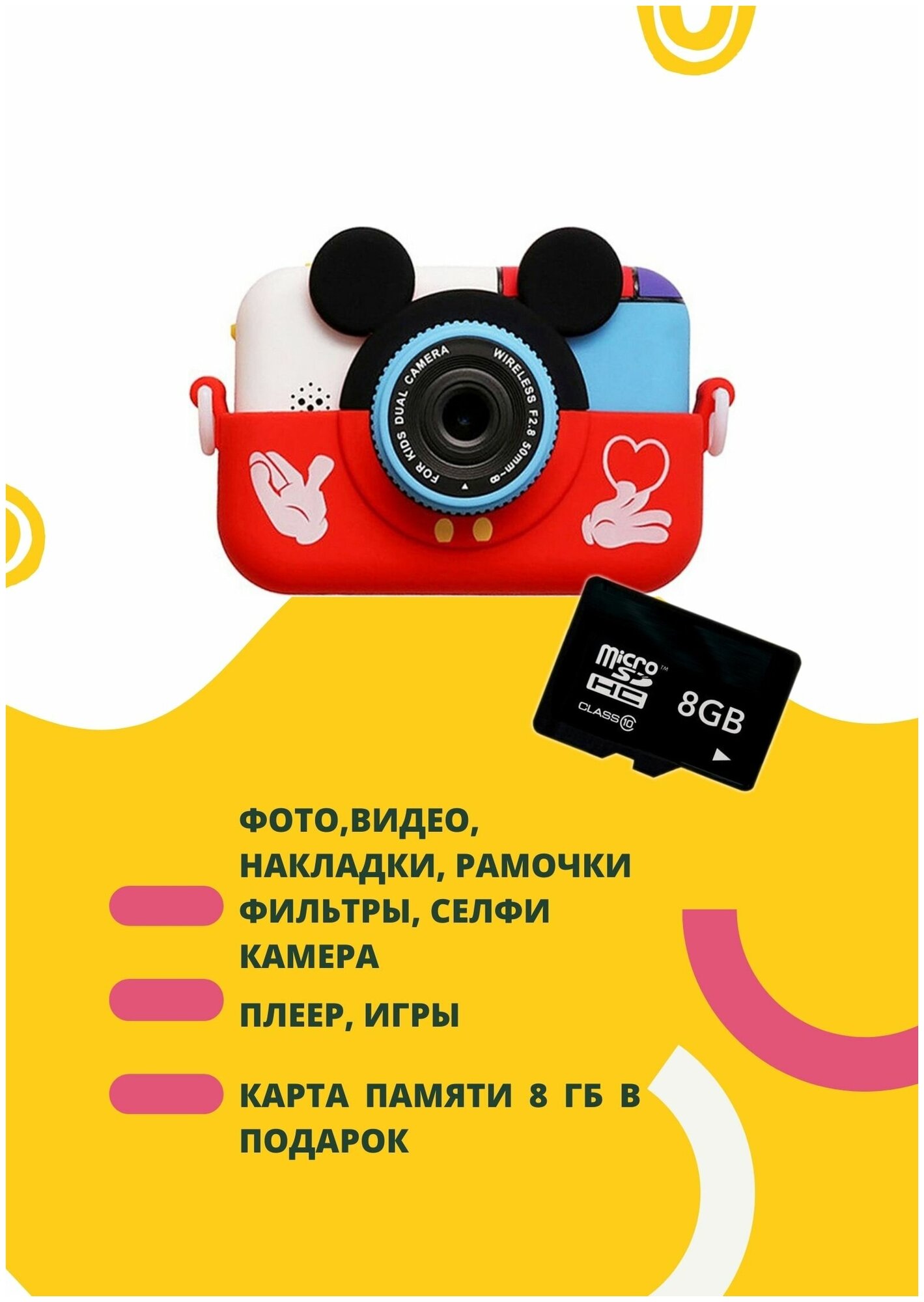 Купить Детский цифровой фотоаппарат игрушка Микки Маус с селфи камерой и играми + карта 8гБ / подарок для детей красный