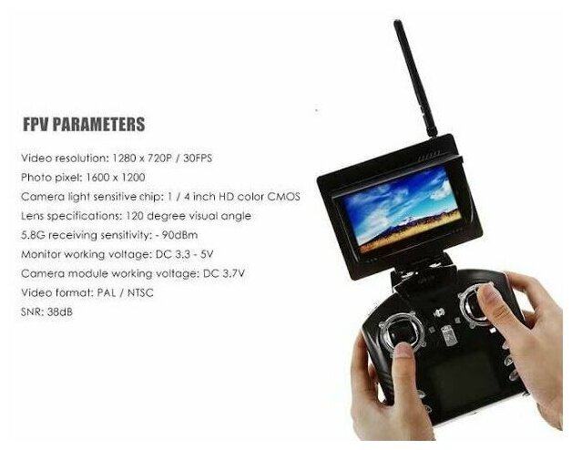 | Комплектация | 1 квадракоптер, 1 пульт, 1 камера, 1 зарядное устройство, 1 USB кабель для зарядки, 1 антенна, 1 отвертка, 1 х держатель дисплея, 2 болта, 2 винта, 4 колеса, 4 запасных лопасти, 1 х 7.4V 1000mAh батарея, 1 (английский + китайский) руководство пользователя. |