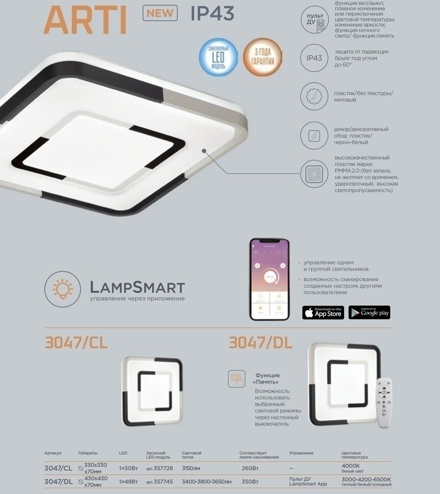 | Управление | датчик движения / диммер / механическое управление / пульт дистанционного управления / управление со смартфона |