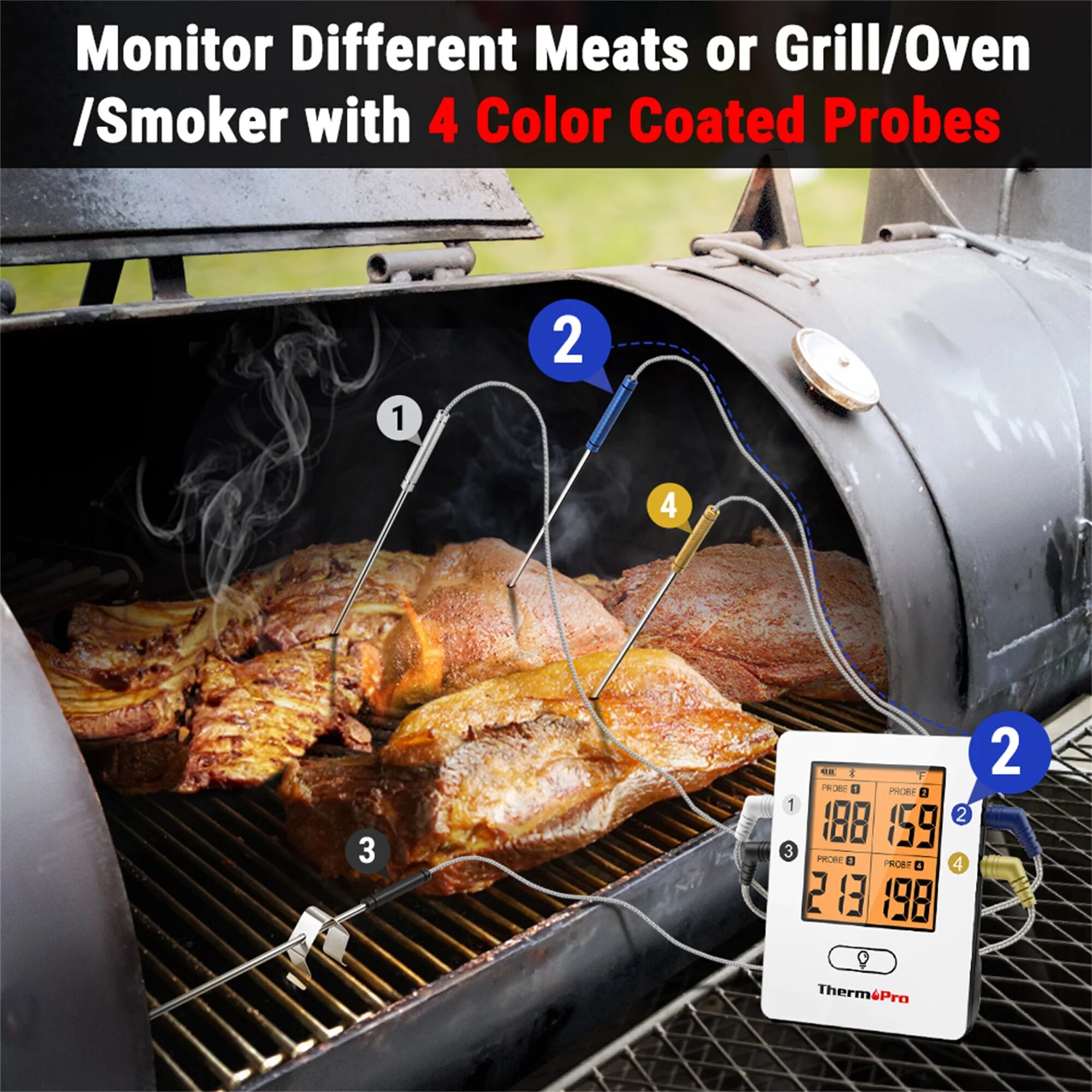 | Дополнительная информация | длина каждого щупа 21 см; 4-х экранный дисплей с подсветкой; управлять термометром можно через сам блок или через смартфон с помощью приложения; функция таймера; источник питания: 2 батарейки ААА |