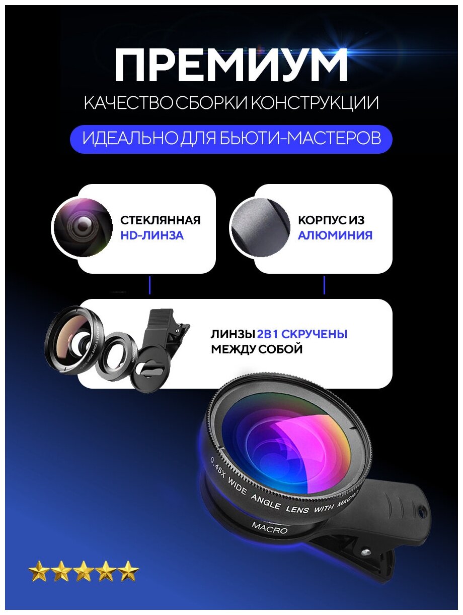 Широкоугольный макрообъектив-линза для телефона 2 в 1, 0.45Х, 37 мм, черный