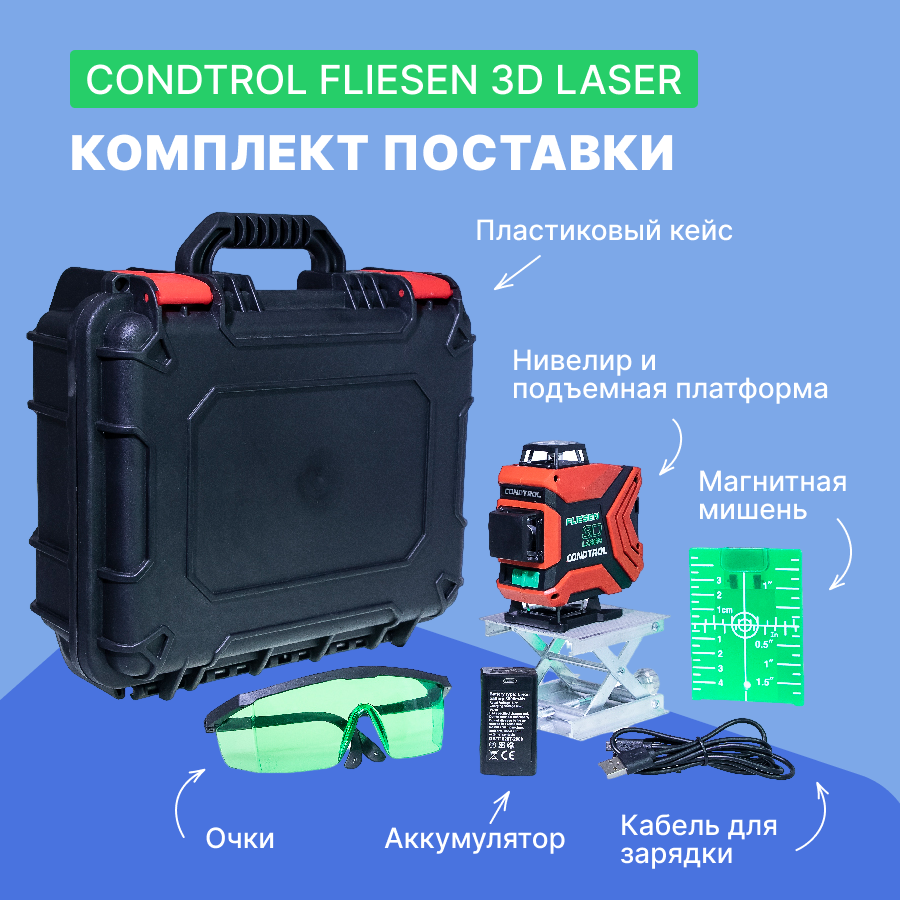 Нивелир лазерный Fliesen 3D Laser (20/40м, +/-0.3мм/м, зеленый, самовыравнивание 5°, 16 лучей, 1/4", 0.42кг, кейс) CONDTROL 7-2-103