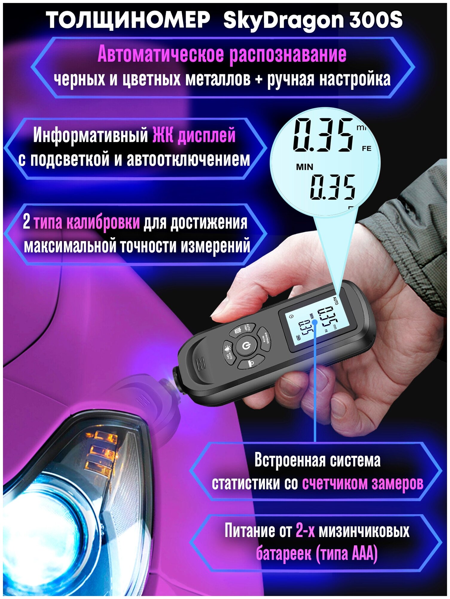 Автомобильный толщиномер лакокрасочного покрытия (ЛКП) SkyDragon 300S интересное:
