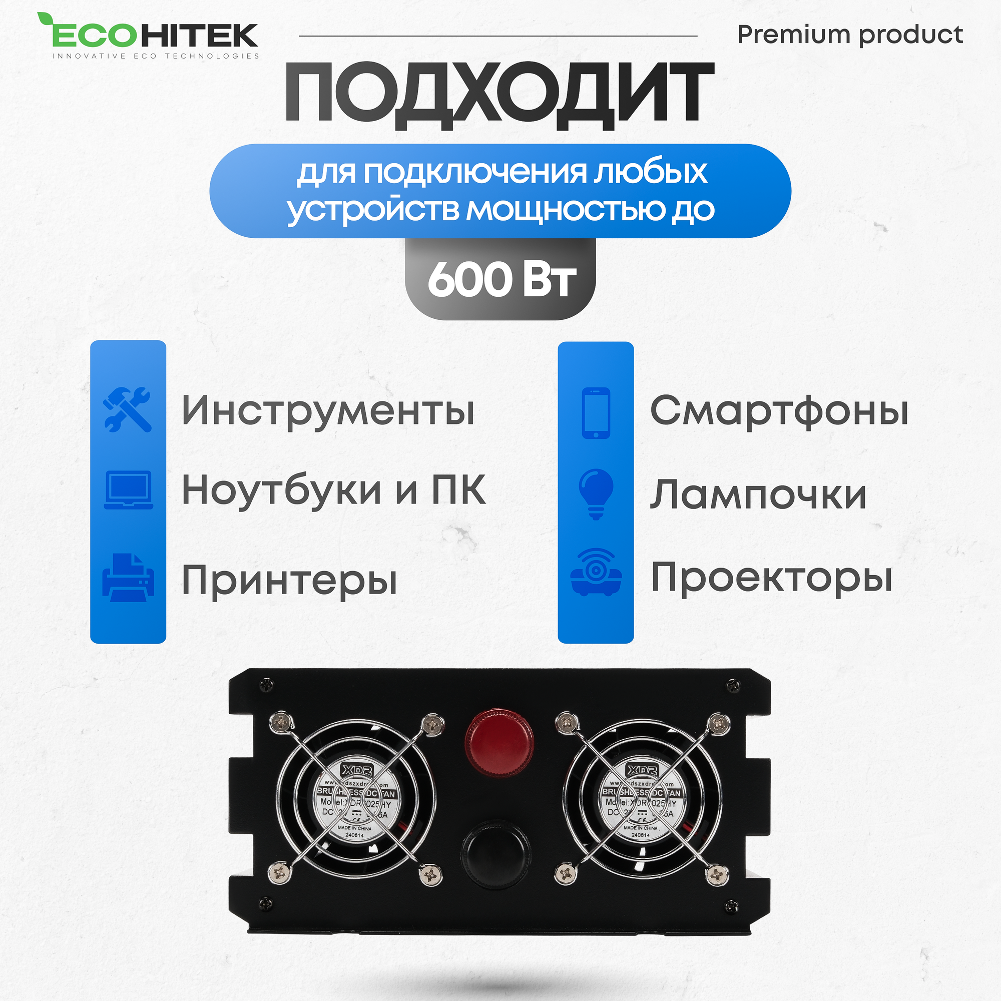 Инвертор автомобильный 12 220В, 1200 Вт (пост нагрузка до 600 Вт). Чистый синус. EcoHitek. Подключение приборов, эл. инструмента, котла отопления.