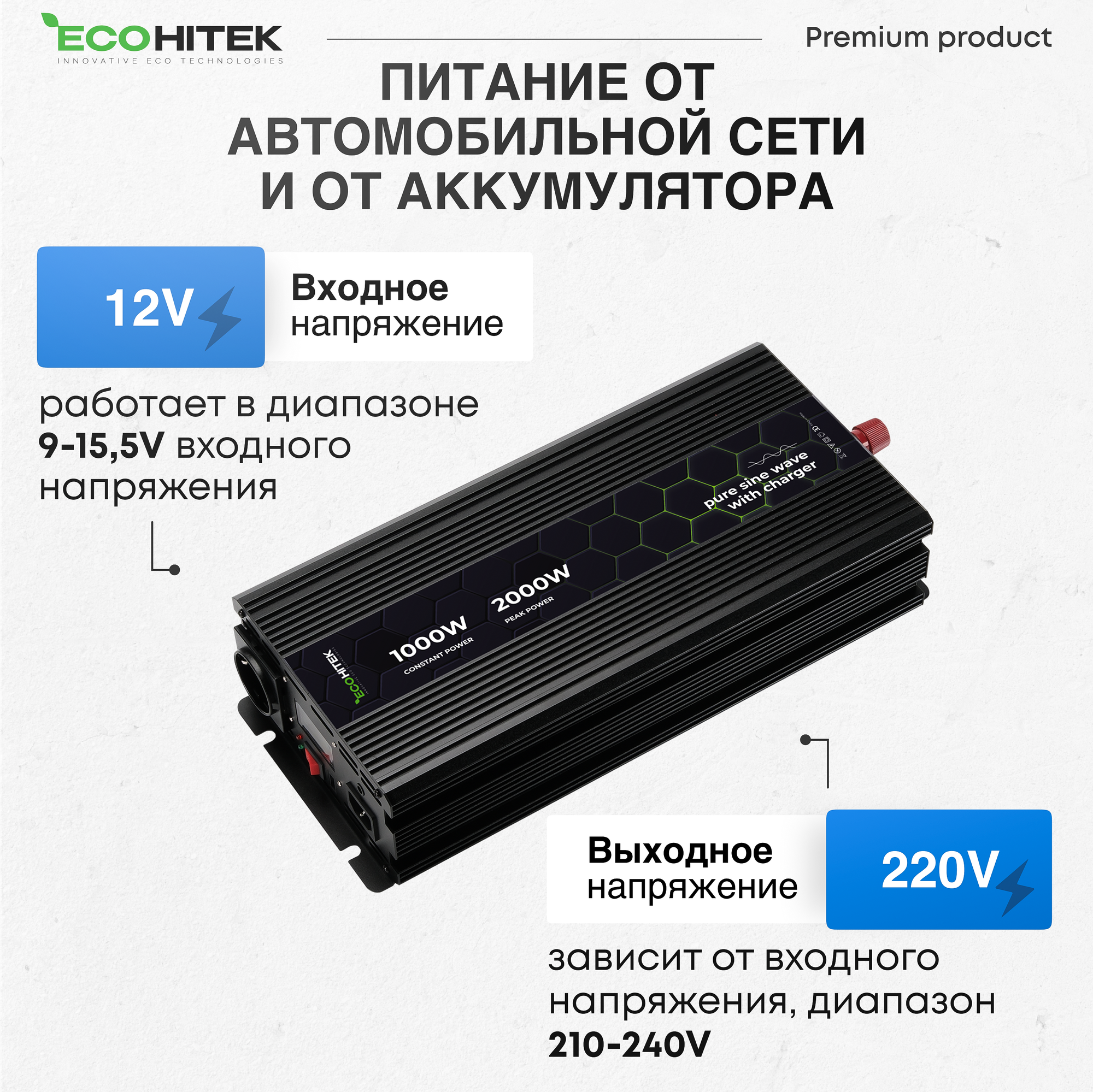 Купить Инвертор автомобильный 12 220В с функцией зарядки аккумулятора. 2000Вт (пост нагруз до 1000Вт) EcoHitek. Чистый синус. Бесперебойное питание для дома