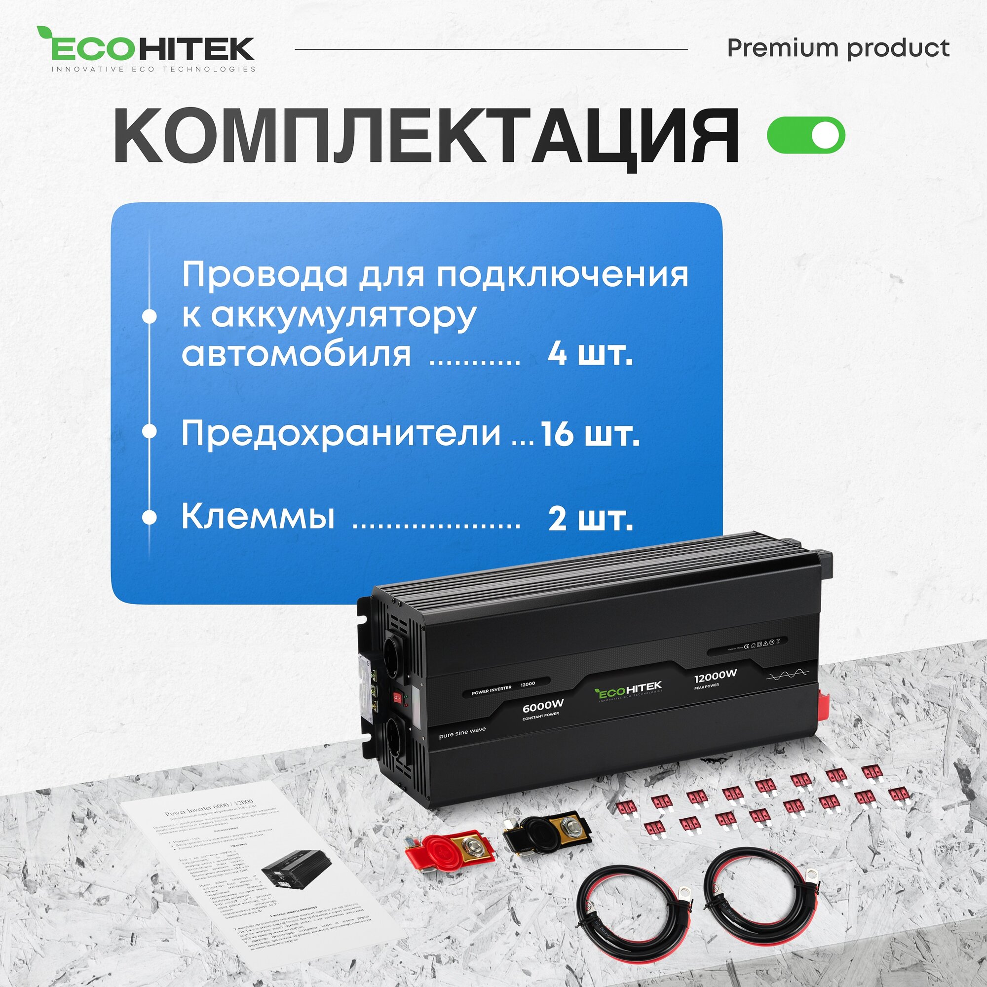 Инвртор автомобильный 12 220, 8000Вт от EcoHitek Автомобильный инвертор напряжения 12 - 220В (пост нагрузка до 4000 Вт). Чистый синус. Подключение приборов, эл. инструмента.