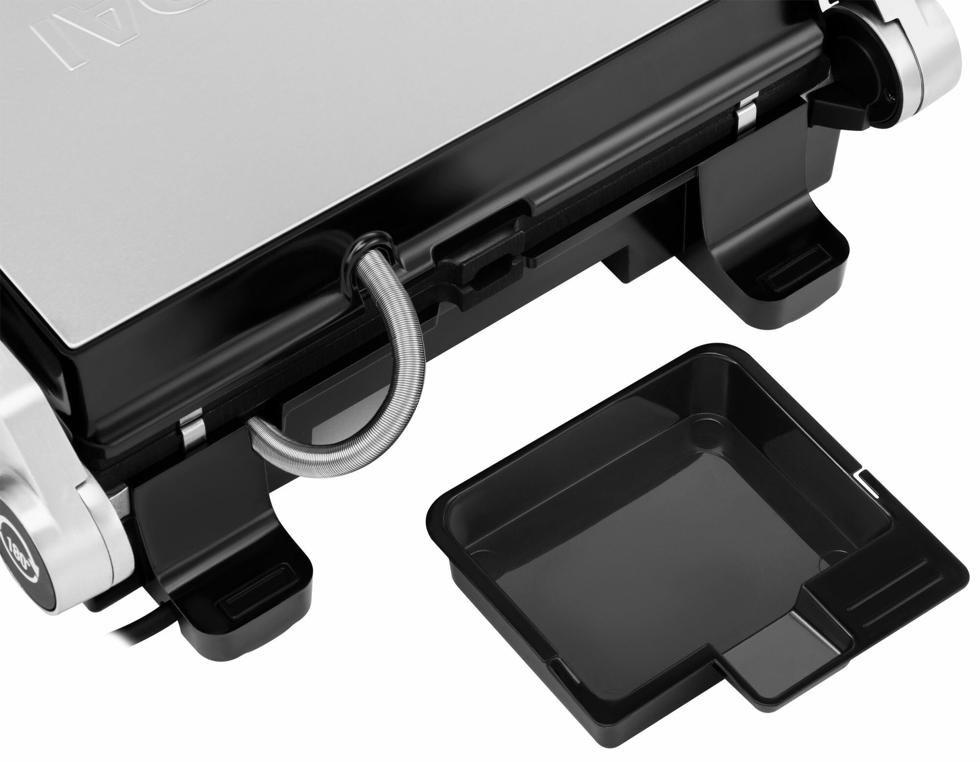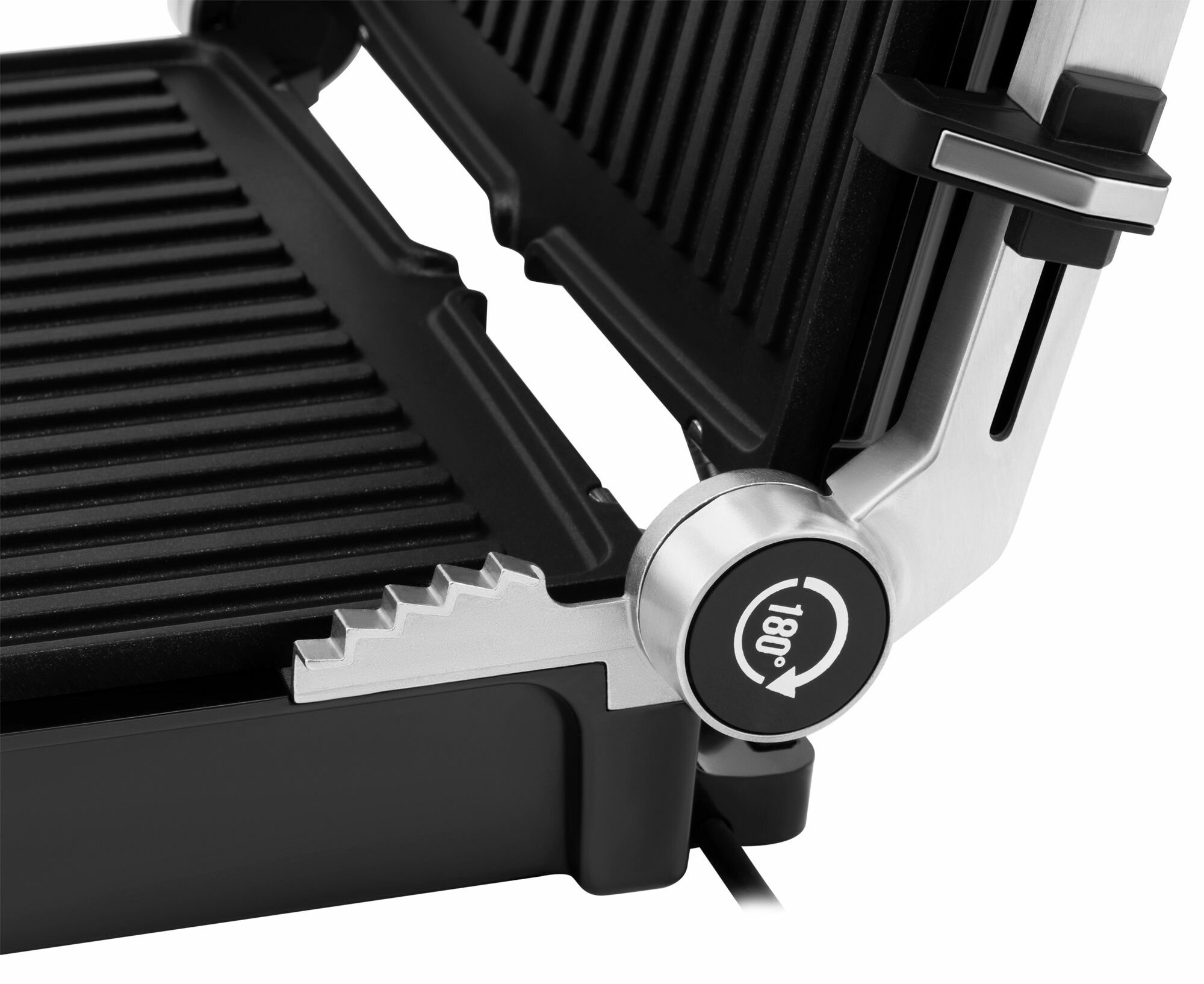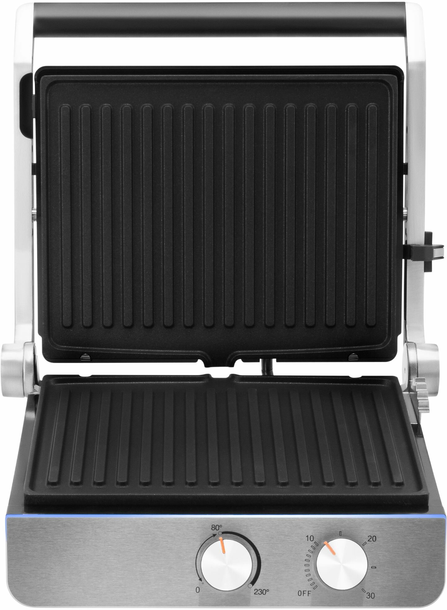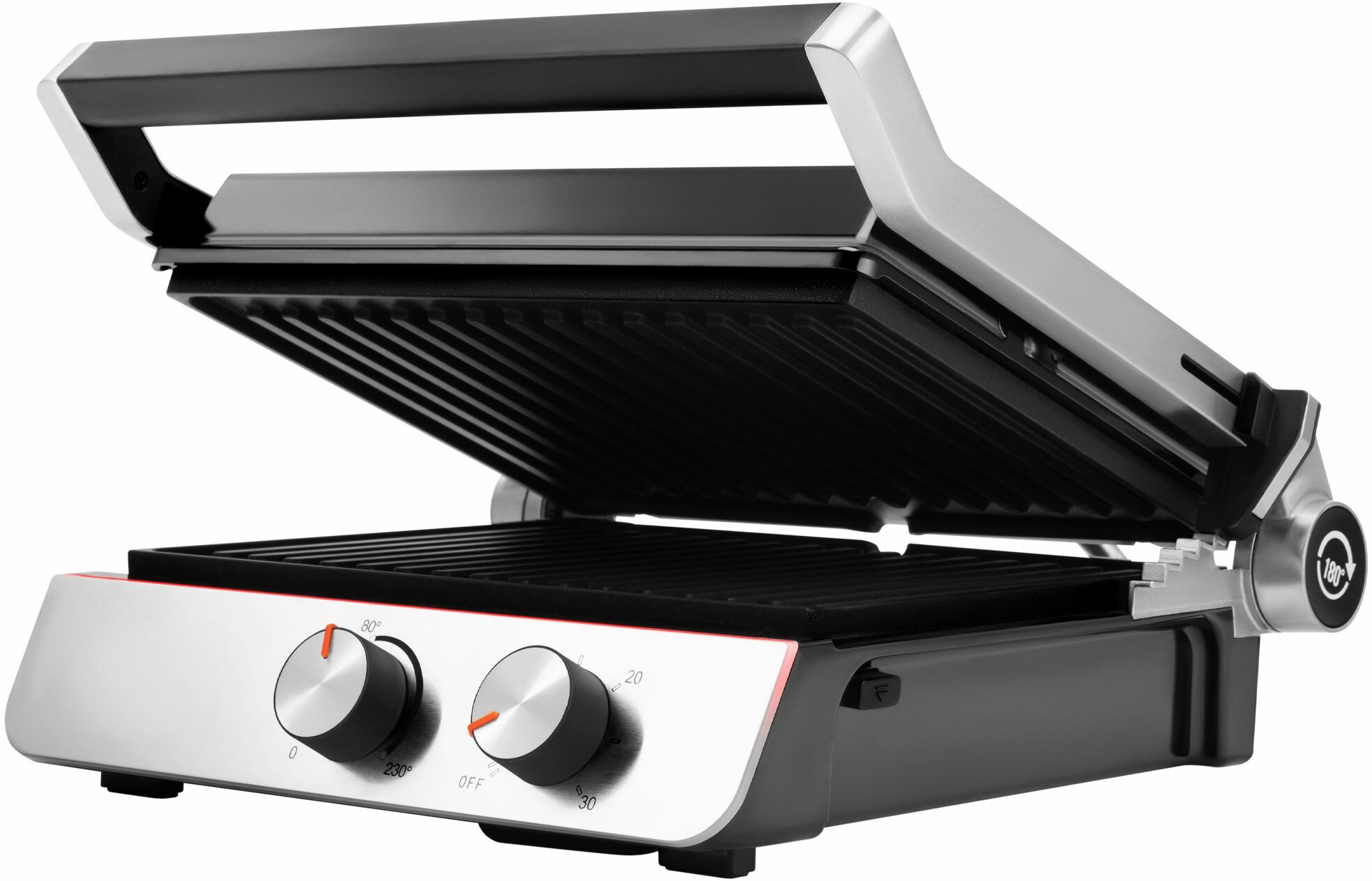 | Плюсы: | Простое механическое управление, раскрывается на 180 градусов что позволяет готовить одновременно на двух панелях, есть лоток для жира. |