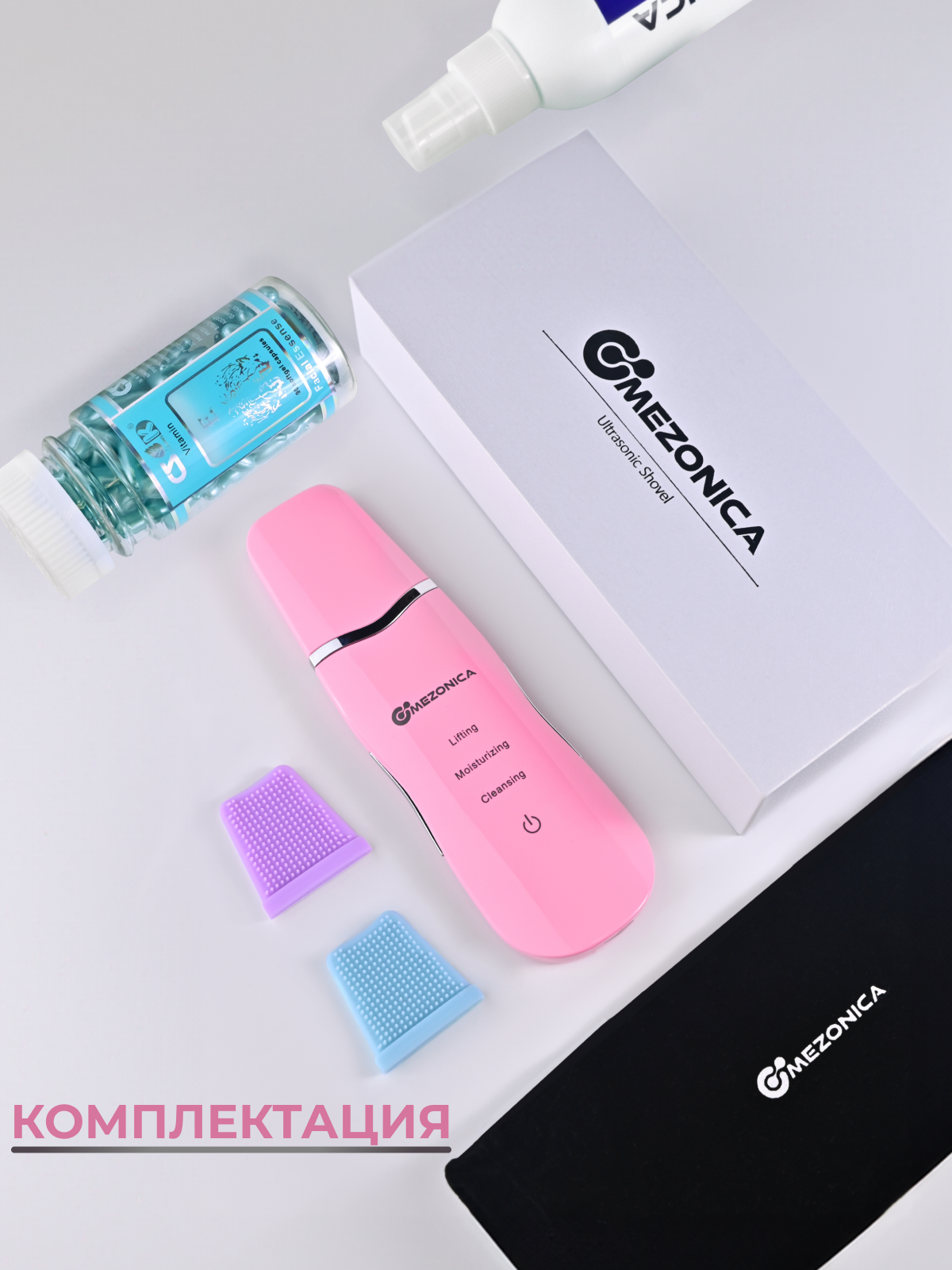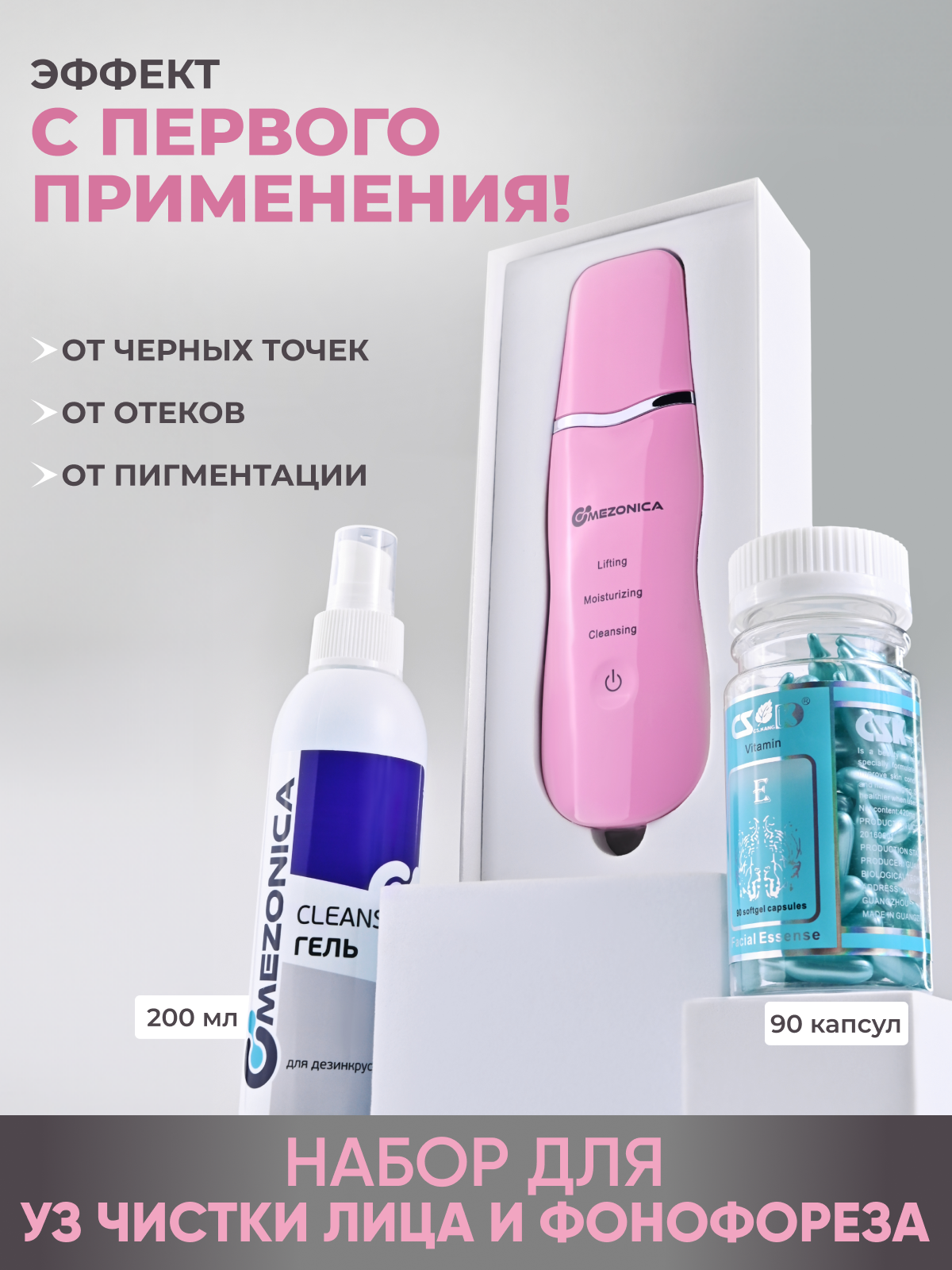 Купить Mezonica Набор 3 в 1 Чистка лица и Омоложение (скрабер, розовый + УЗ гель холодного гидрирования + Серум капсулы витамин Е )