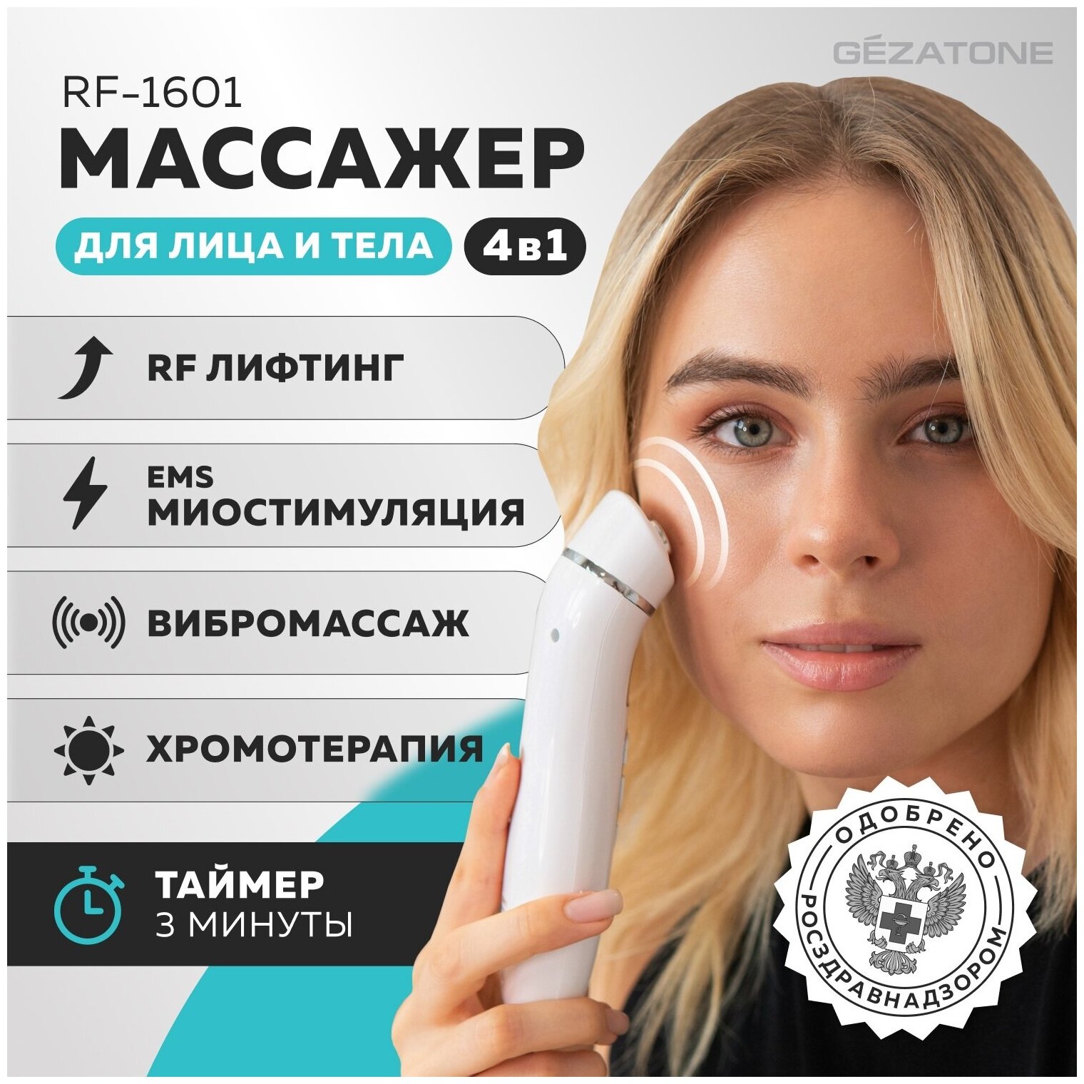 Gezatone, Массажер для лица и тела, RF-лифтинг против морщин и второго подбородка, миостимуляция, вибромассаж, светотерапия, RF-1601 интересное: