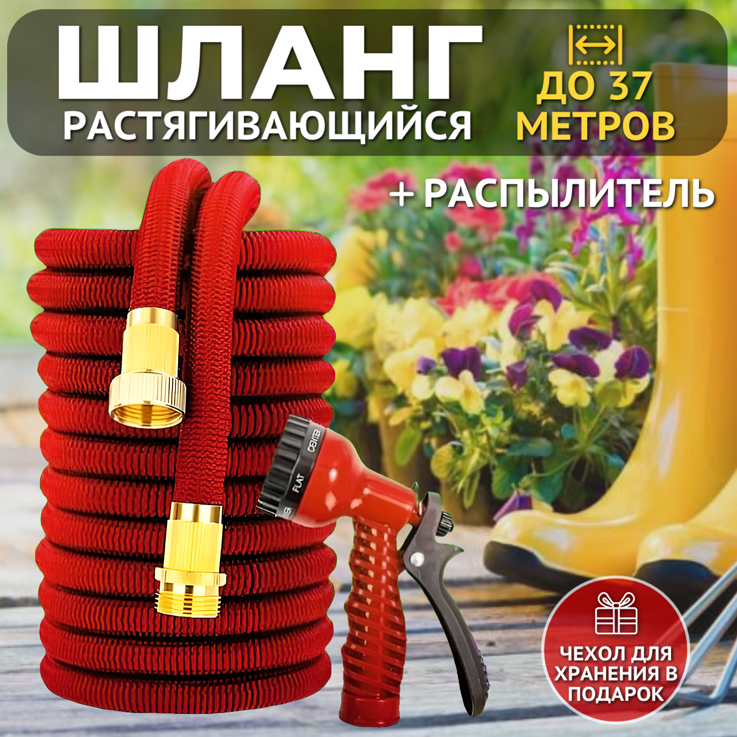 Шланг растягивающийся для полива "Magic Garden Hose" от 7,5 до 37 метров, с латунными разъемами и распылителем / Чехол в подарок