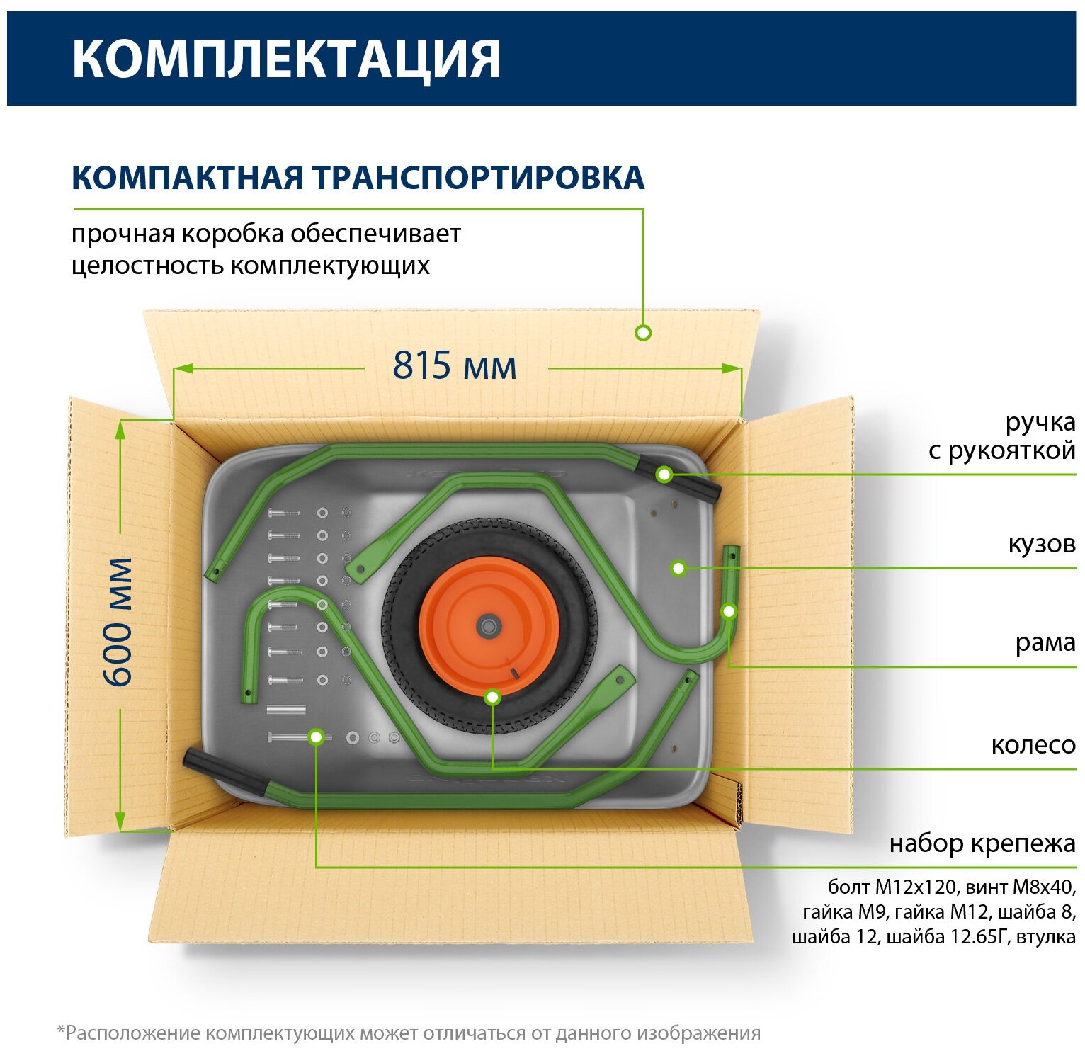 | Дополнительная информация | Колесо 360 мм, 3.00–8, диаметр оси – 12 мм. Диаметр труб: 25 мм, толщина корыта: 1,5 мм. |