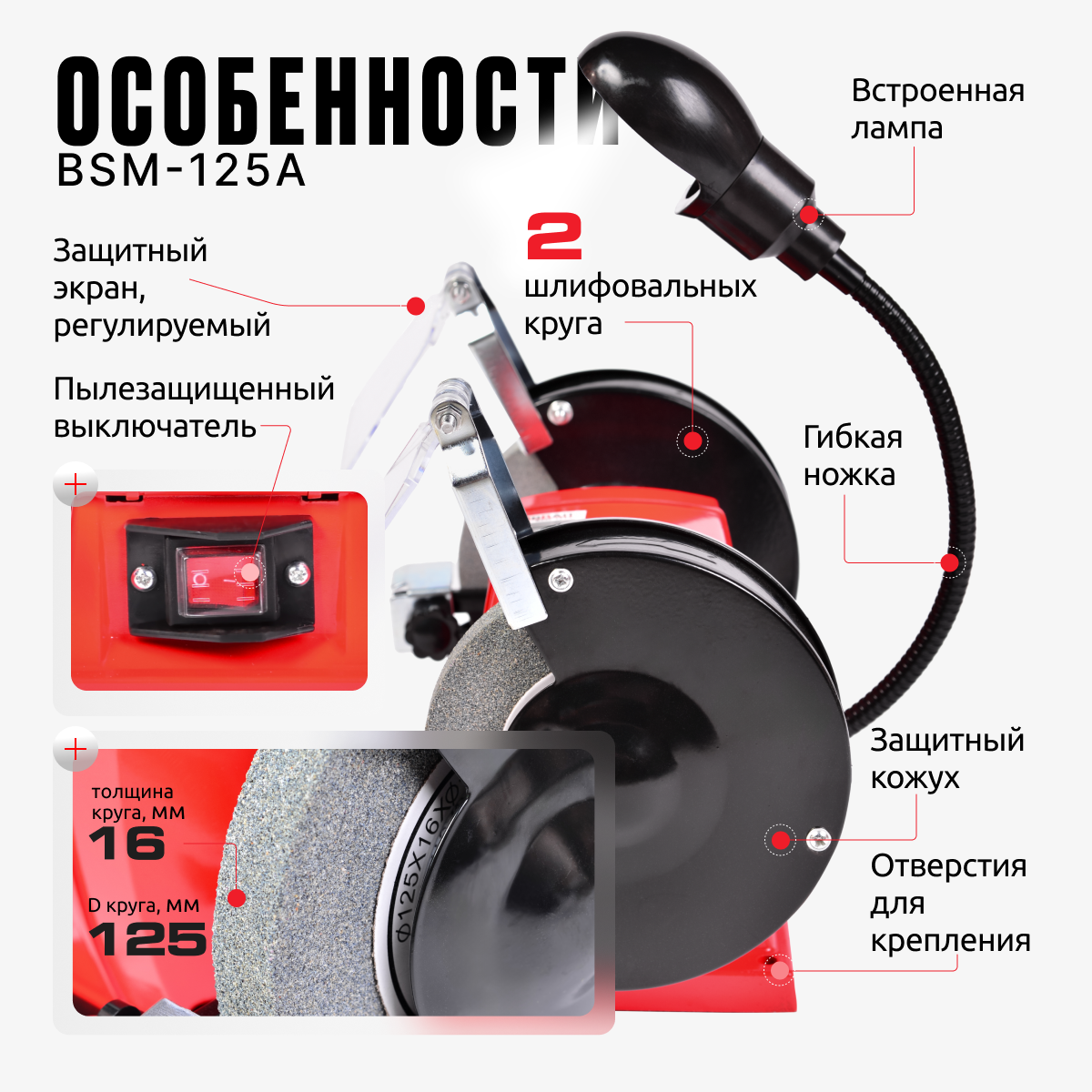 Станок точильный BSM-125A (с лампой) (Мощность 200Вт, размер заточного круга 125х16х12,7, число оборотов 2840 об/мин)