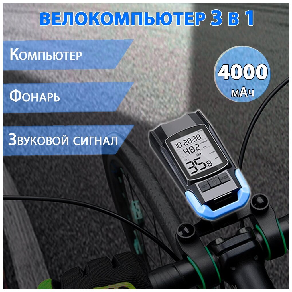 Купить Велокомпьютер 3 в 1 - фонарь, компьютер, звуковой сигнал 120 дБ (АКБ 4000 мАч) синий