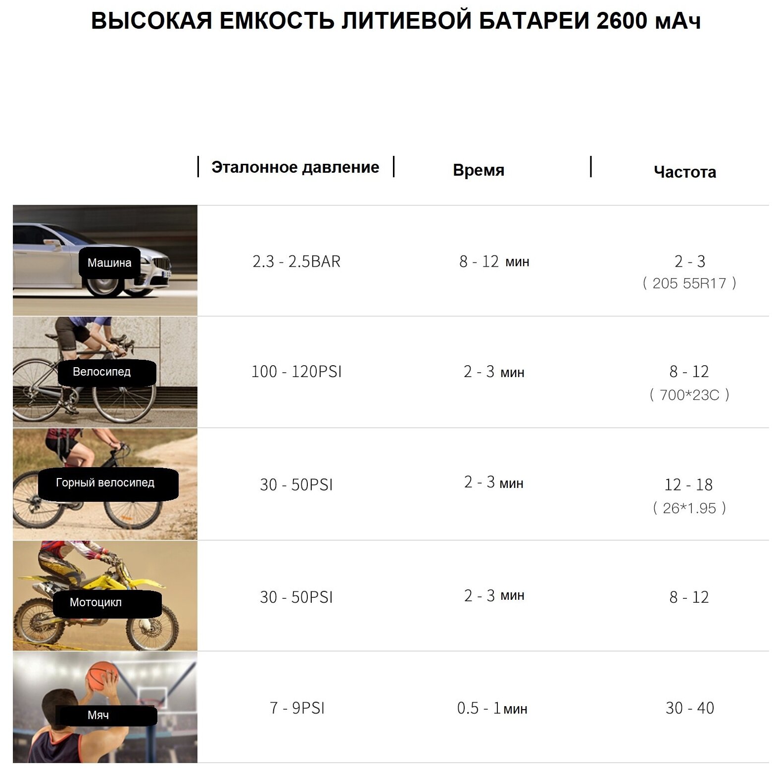 | Плюсы: | Есть индикатор текущего давления, имеет несколько переходников, компактный, аккумулятор устройства хорошо держит заряд, есть встроенные программы со стандартными параметрами для накачки велосипеда, скутера и мяча |