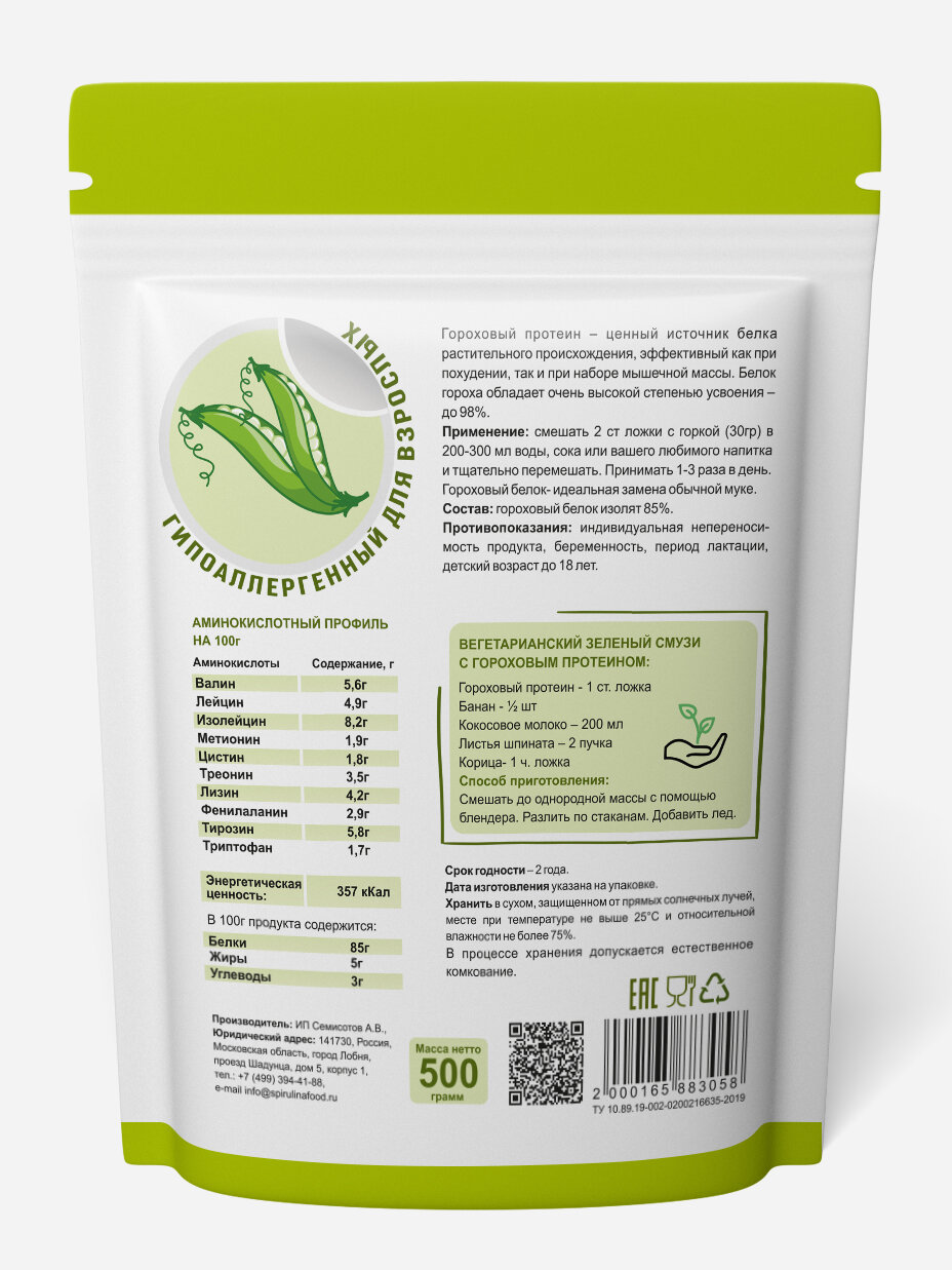 | Дополнительная информация | гороховый протеин изолят 85%; рекомендации по применению: Применение: Добавьте 1 большую мерную ложку (33 г) в любимый смуззи или смешайте с водой или молоком, и примите через 30-60 минут после тренировки — или в любое желаемое время в качестве дополнительного источника белка.; размер порции в г(мл): 33; состав: Профиль незаменимых аминокислот на 100г: Валин-5,6г Лейцин-4,9г Изолейцин-г Метионин-1,9г Цистин-1,8г Треонин-3,5г Лизин-4,2г Фенилаланин-2,9г Тирозин-5,8г Триптофан-1,7г |