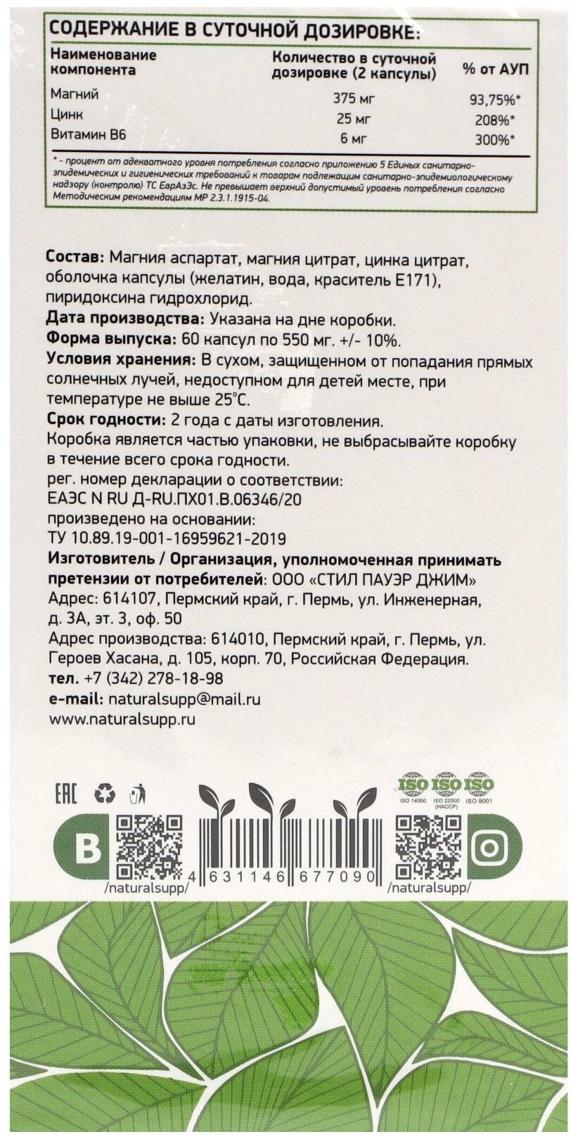 | Дополнительная информация | рекомендации по применению: взрослым по 1 капсуле 2 раза в день во время еды; состав: магния аспартат, магния цитрат, цинка цитрат, желатин, вода, пиридоксина гидрохлорид, краситель Е171 |