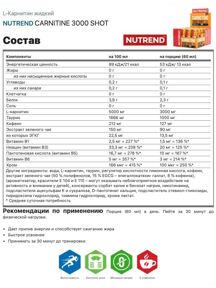 L-Карнитин жидкий NUTREND CARNITINE 3000 SHOT 60 мл, Ананас